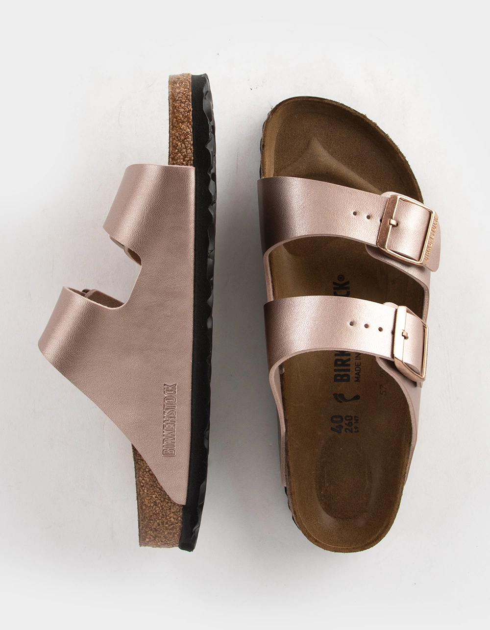Birkenstock Arizona Sandals. An icon of timeless design and legendary comfort, the Arizona sandal has been defining style since 1973. An electric gold finish transforms the classic look into your favorite be-seen pair, outfitted with tonal buckles to elevate the look. Complete with classic Birkenstock design elements, like a contoured cork-latex footbed for the ultimate in support. Birko-Flor® upper with pearlized shimmer. Suede footbed lining helps keep you comfortable. EVA sole is flexible and lightweight. Imported.