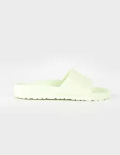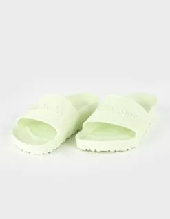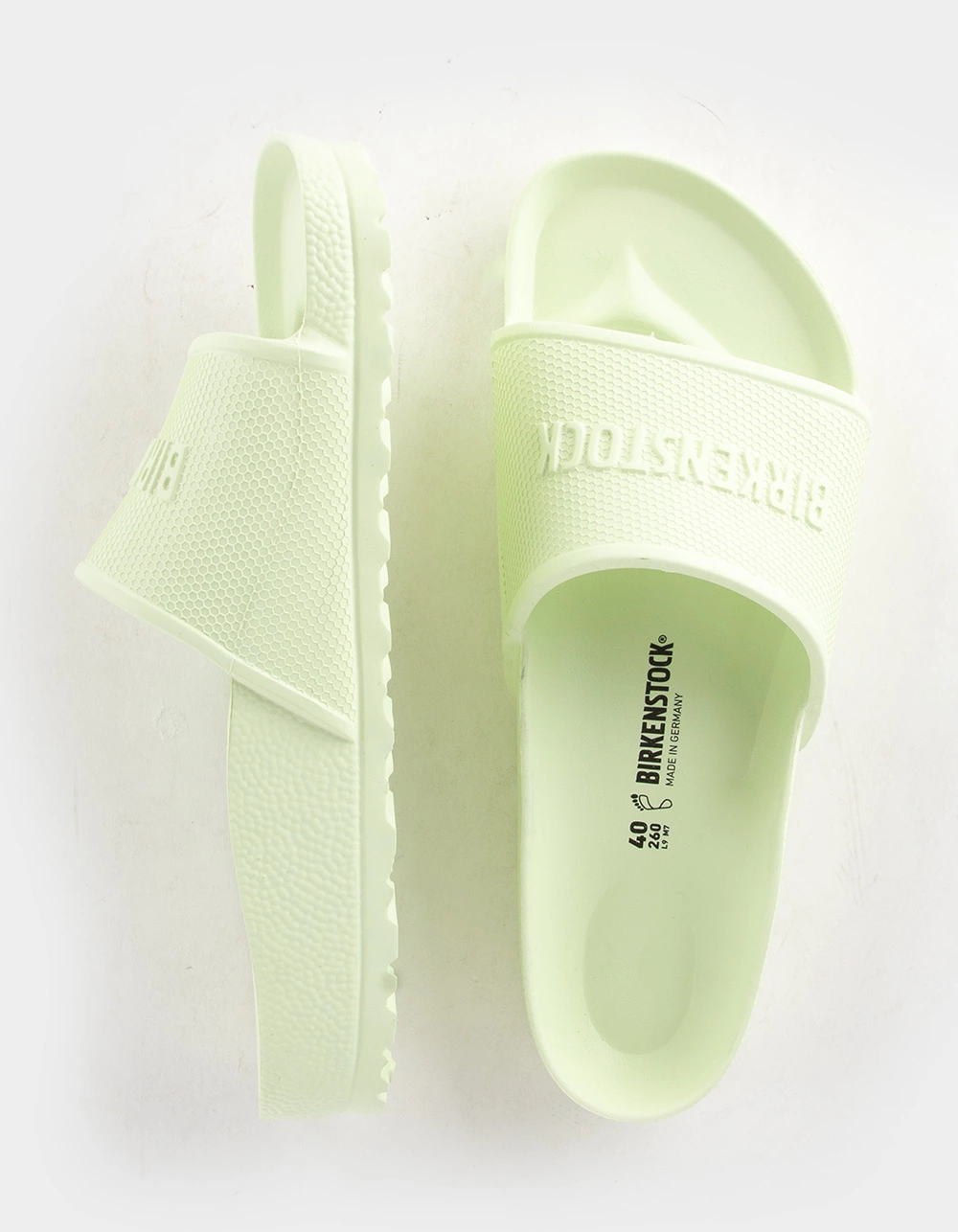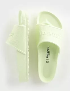 Birkenstock Barbados EVA Sandals. The Birkenstock Barbados is a sporty slide design with an embossed upper and logo lettering. Modeled on the cork sandal, this sandal is made from one piece of light, flexible and waterproof molded EVA. Imported.