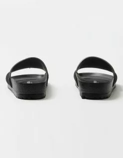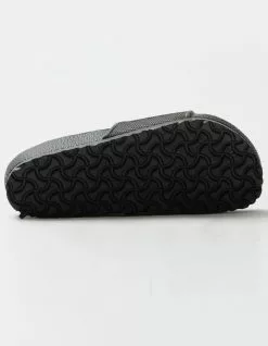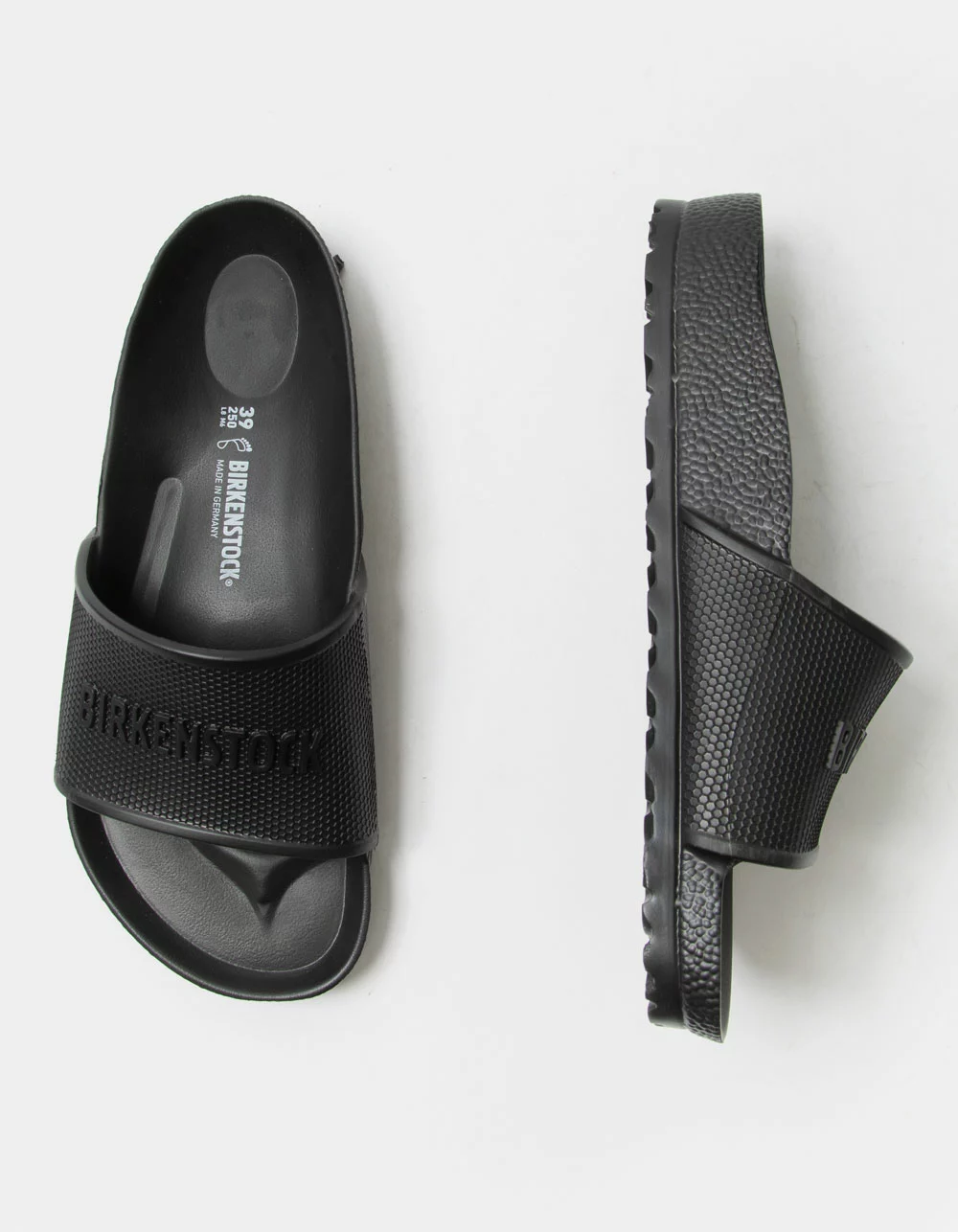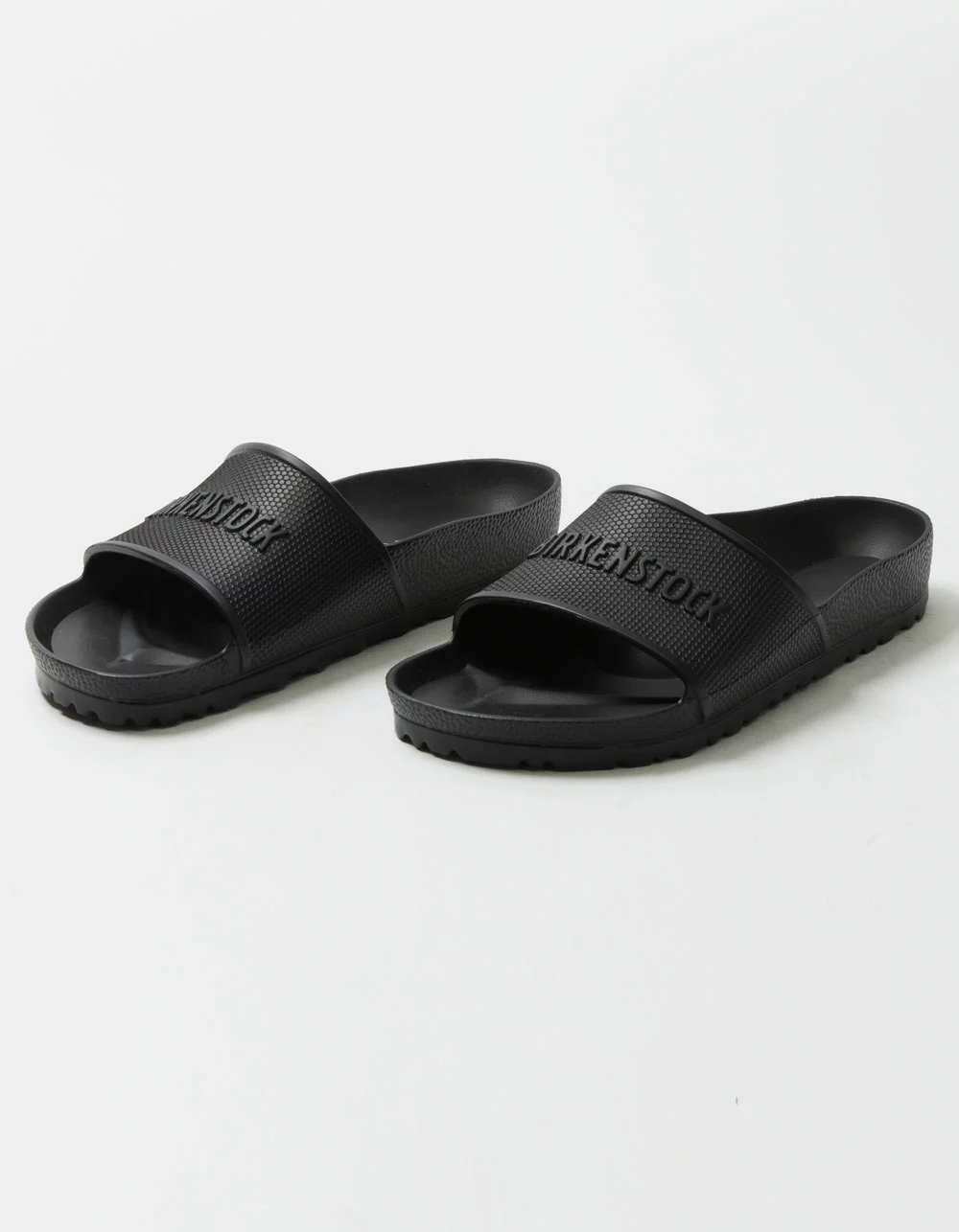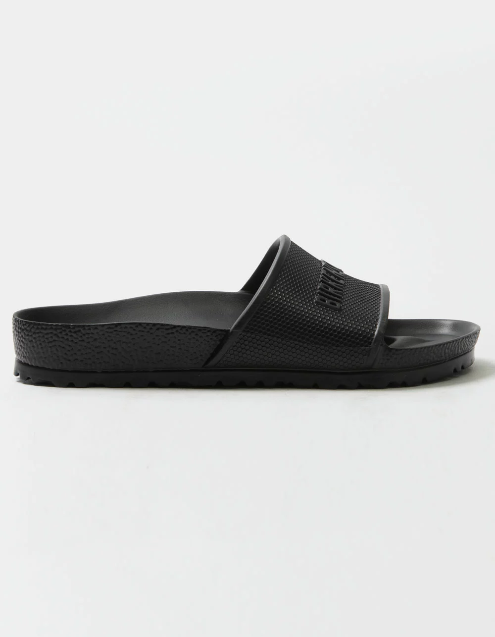 Birkenstock Barbados EVA Slide Sandals. The BIRKENSTOCK Barbados is a sporty slide design with an embossed upper and logo lettering. Modeled on the cork sandal, this sandal is made from one piece of light, flexible and waterproof molded EVA. Anatomically shaped BIRKENSTOCK footbed made from EVA. Molded single piece of EVA upper. Waterproof, washable, ultra lightweight. Imported.