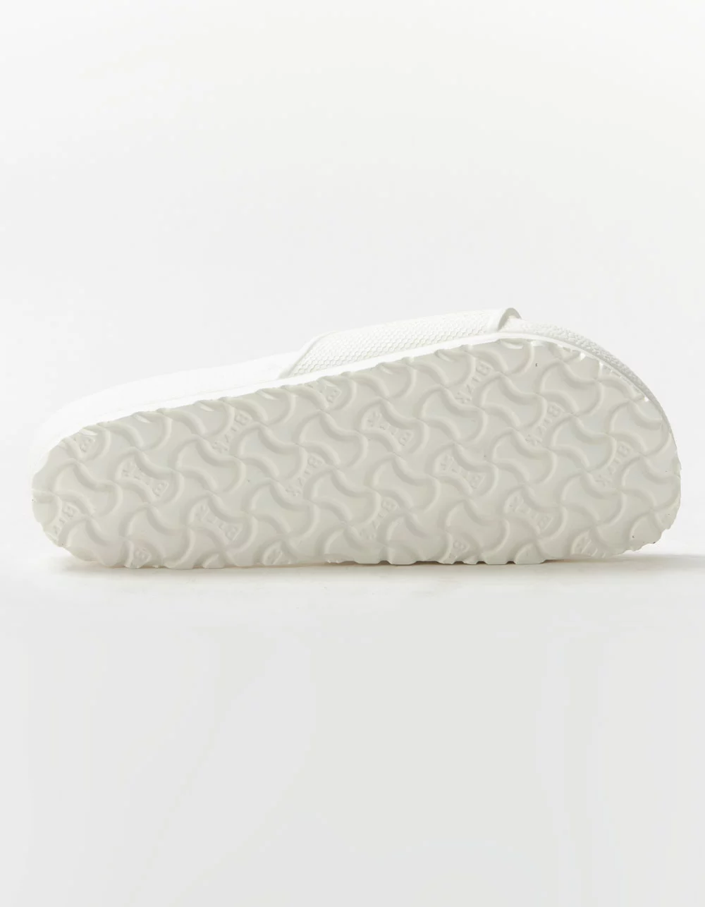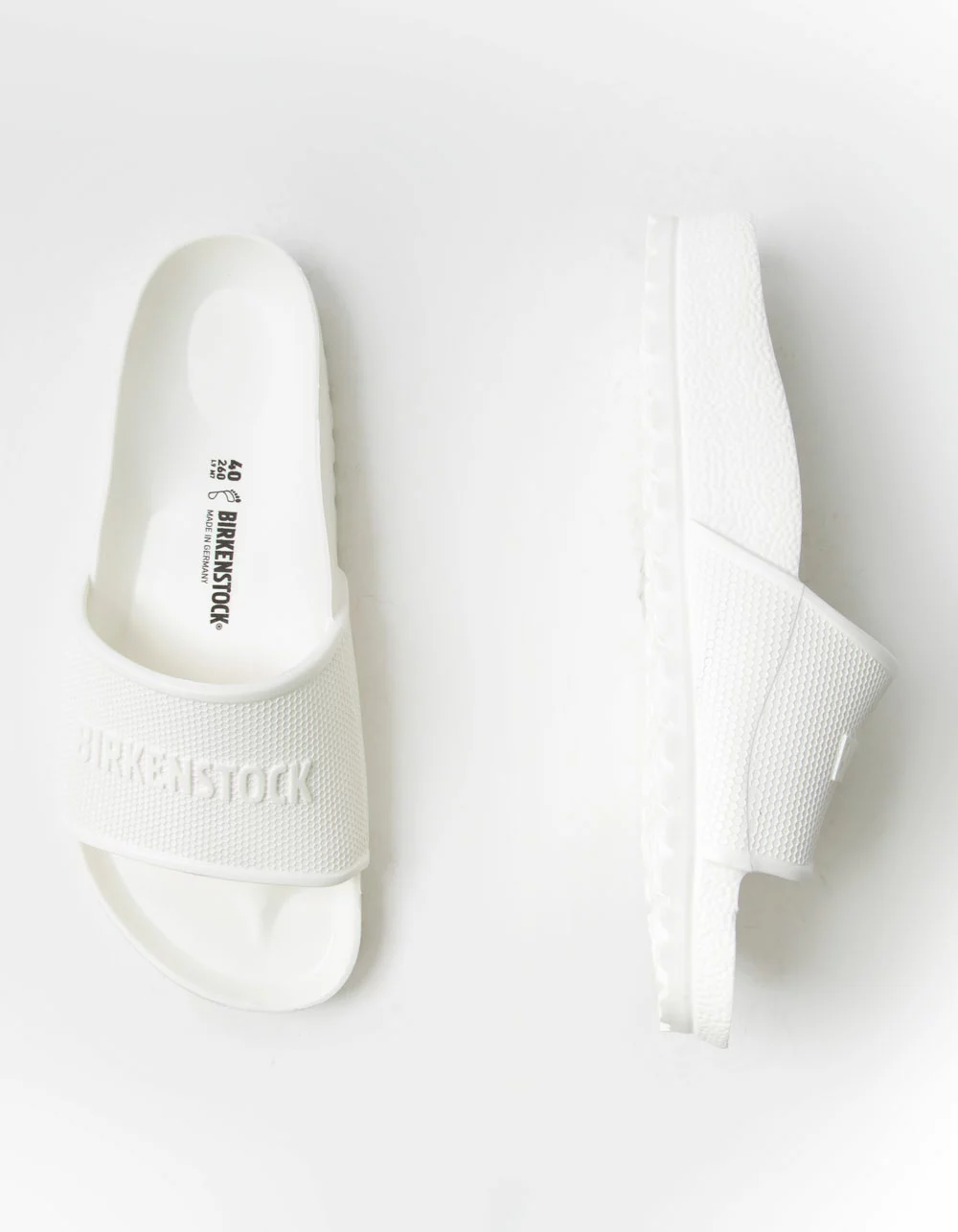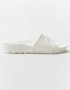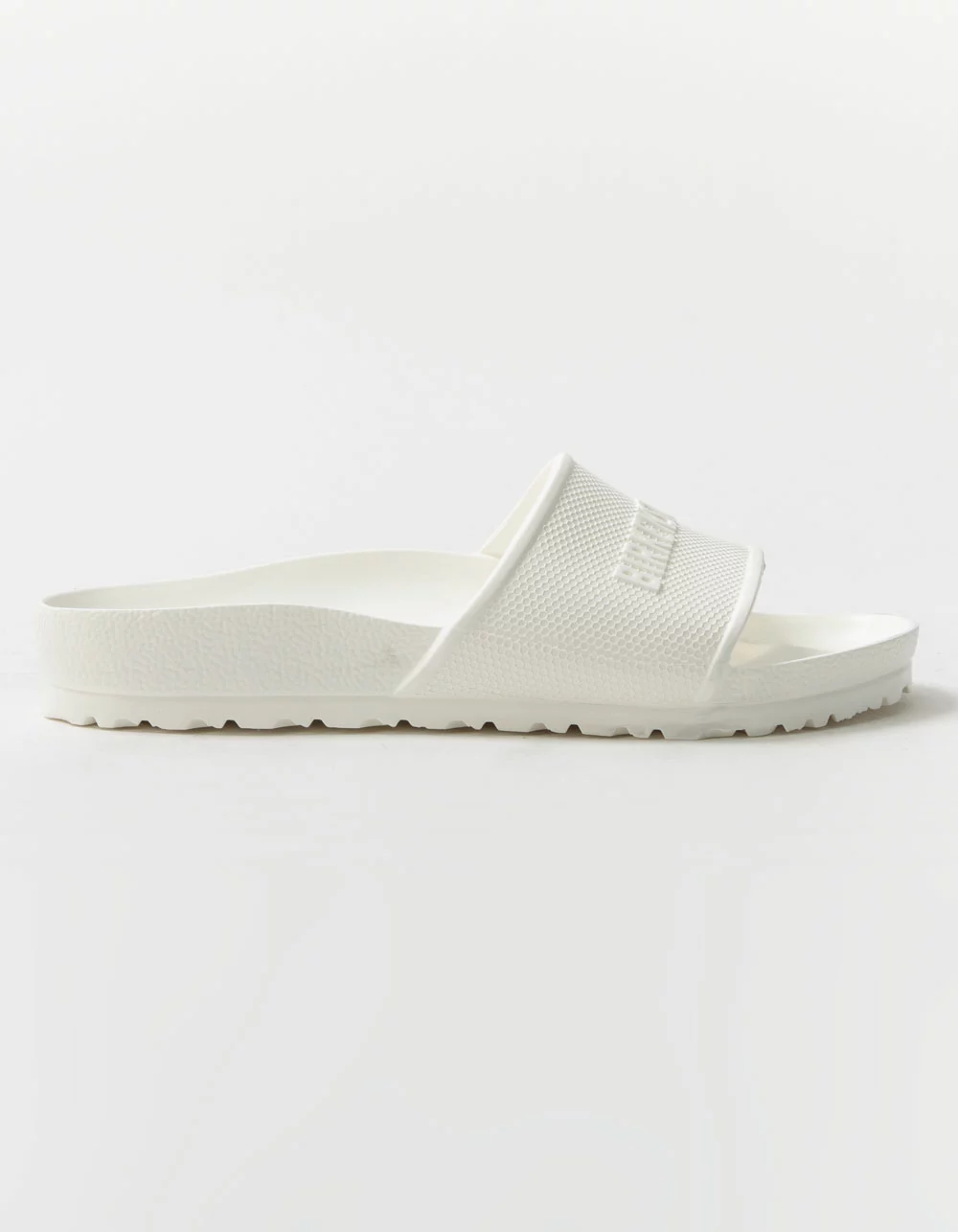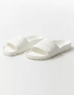 Birkenstock Barbados EVA Slide Sandals. The BIRKENSTOCK Barbados is a sporty slide design with an embossed upper and logo lettering. Modeled on the cork sandal, this sandal is made from one piece of light, flexible and waterproof molded EVA. Imported.