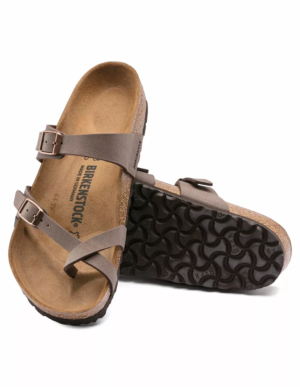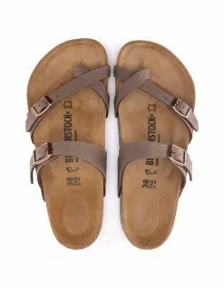 Birkenstock Mayari Sandals. The BIRKENSTOCK Mayari thong sandal is a jaunty model with a toe loop. The impressive combination of design and wearability will see fashion-conscious men and women through the day with elegance and comfort. The upper is made from the skin-friendly, hard-wearing synthetic material Birko-Flor® in a sophisticated nubuck look which boasts a texture and color that could almost be mistaken for real leather.