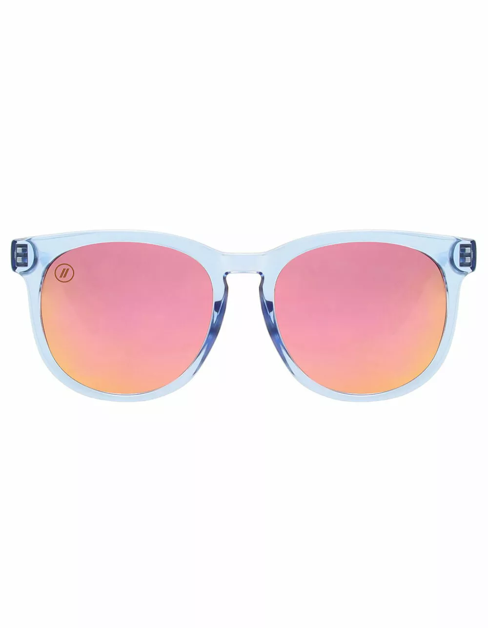 Blenders Pacific Grace Polarized Sunglasses. Clear blue gloss round frames. Reflective polarized lenses. Spring loaded hinge. Slim arms with stripe details. 100% UV Protection. Includes microfiber pouch. Imported.