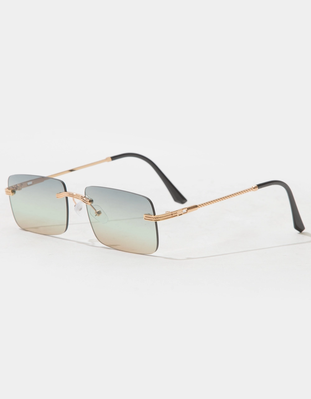 Blue Crown Camilla Rectangle Rimless Sunglasses. Rimless. Plastic nose guards. Imported. WARNING PROP 65: This product can expose you to chemicals including lead, which is known to the State of California to cause cancer and birth defects or other reproductive harm. For more information go to www.P65Warnings.ca.gov.