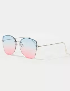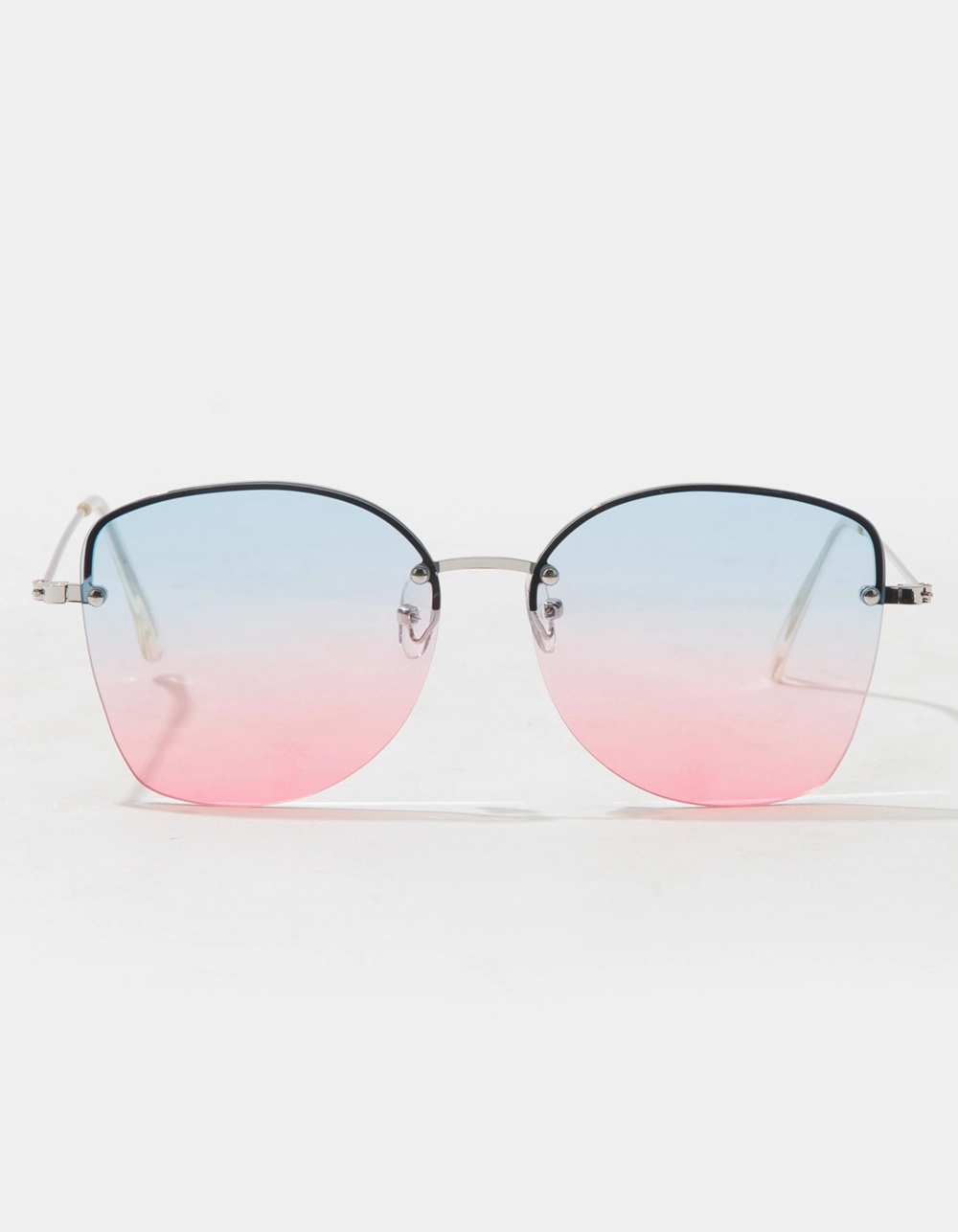Blue Crown Rimless Round Cat Eye Sunglasses. Rimless. Plastic arms & nose guards. Rimless round cat eye frames. Imported.