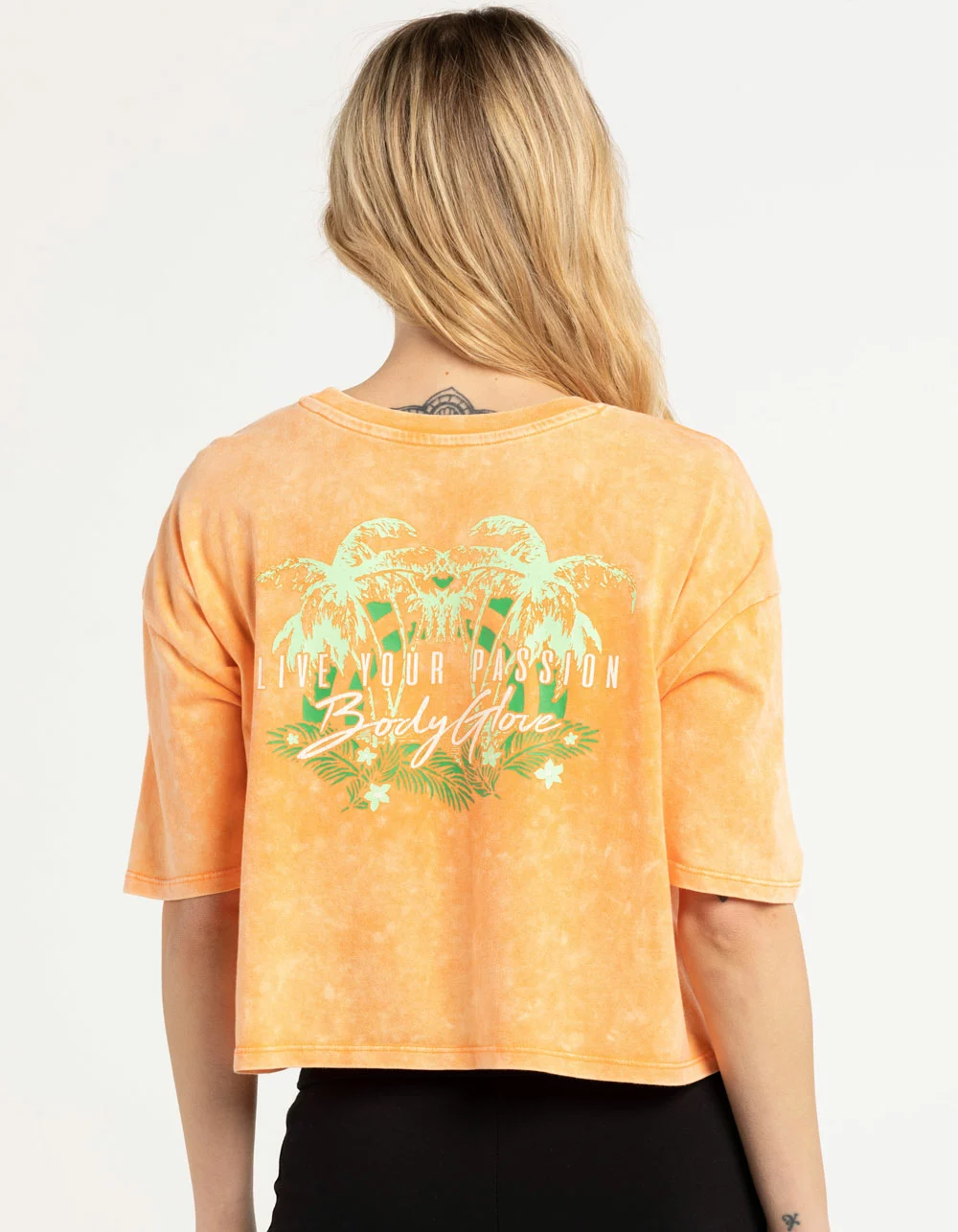 Body Glove Live Your Passion Boxy Tee. Body Glove script screened on left chest. Large graphic on back. Ribbed crew neckline. Short sleeve. Acid wash. Boxy and loose fit. 100% Cotton. Machine wash. Imported.