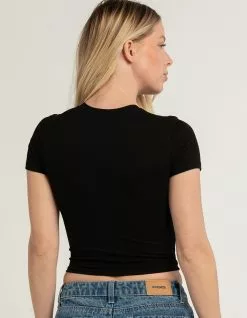 Bozzolo Corset Tee. Rib knit. Crewneck. Stitch detailing to emulate a corset. Short sleeve. Cropped fit. 47.5% Polyester, 47.5% Rayon, 5% Spandex. Hand wash. Imported.