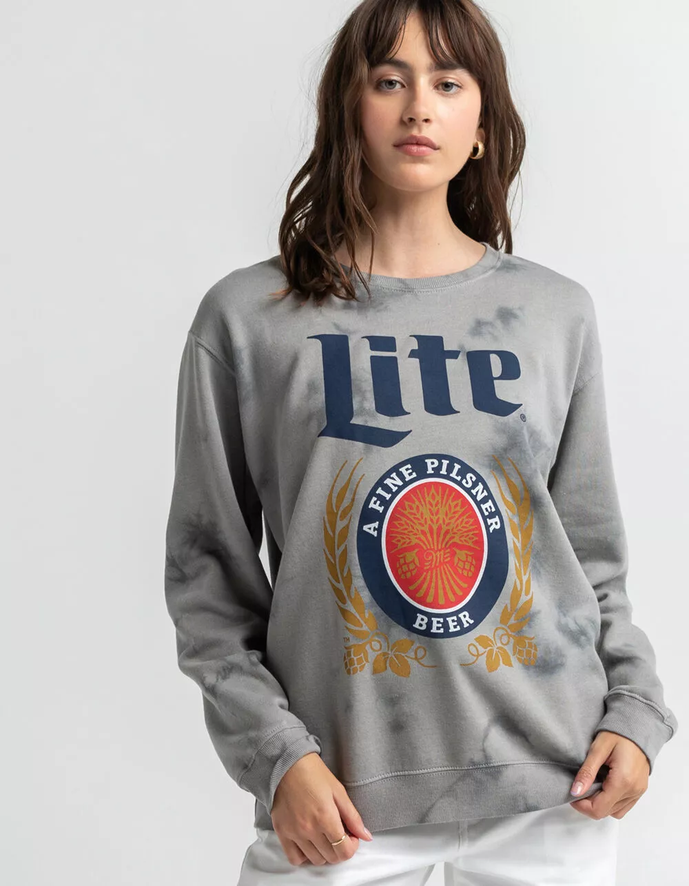 Fleece pullover with allover tie dye wash. Features Miller Lite logo screened at front. Ribbed crew neck, cuffs, and hem. 60% polyester/40% cotton. Machine wash. Imported.