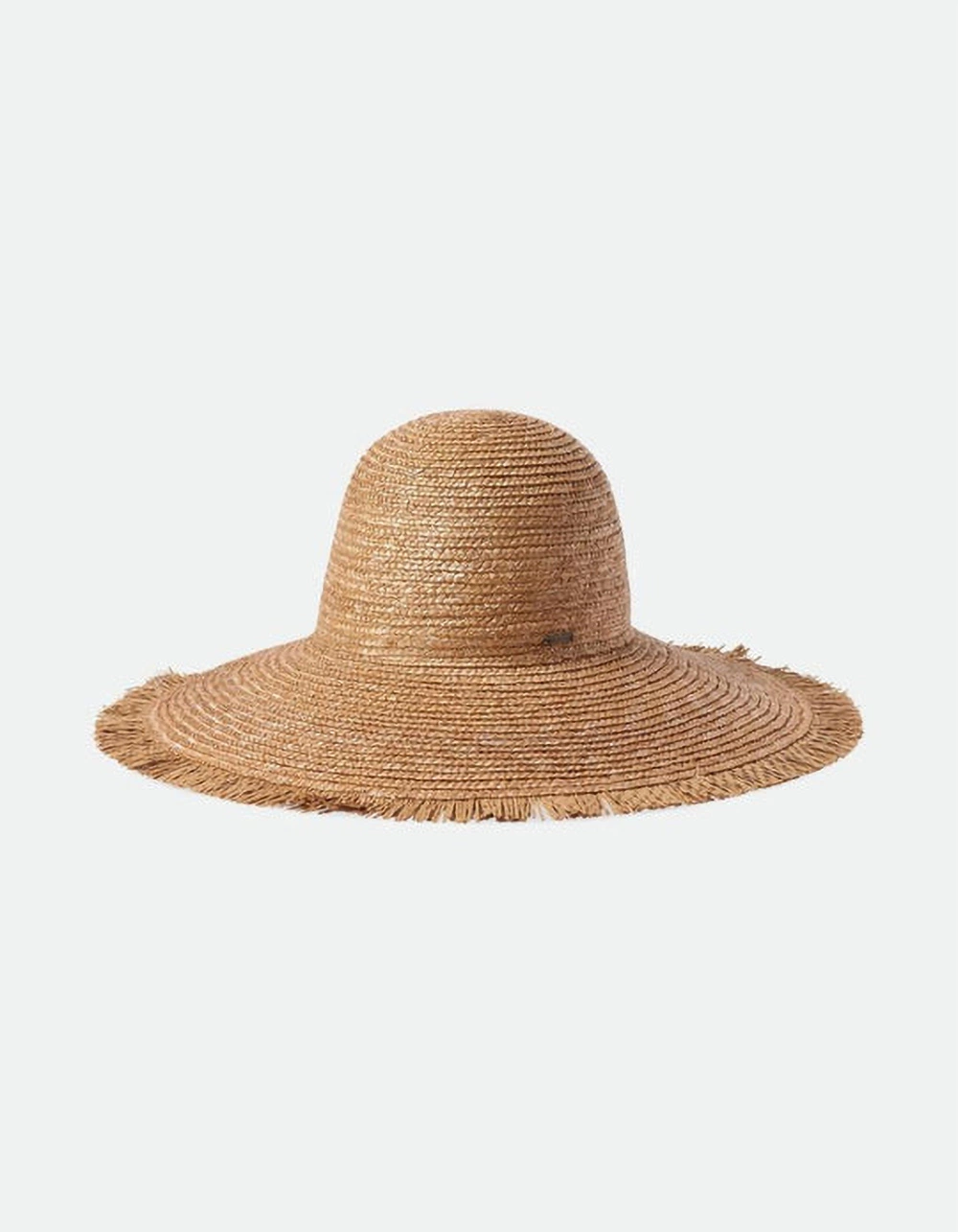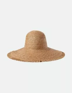 Brixton Dion Sun Hat. Naturally sun protective and woven in wheat straw. The Dion Sun Hat has a clean crown contrasted with a raw fringe edge. Perfect for garden parties and sun-soaked afternoons. 5.25″ brim. 5″ crown. Medium stiffness. Raw fringe detail. Custom metal headwear plaque. 50+ UPF. 100% Wheat Straw. Imported.