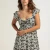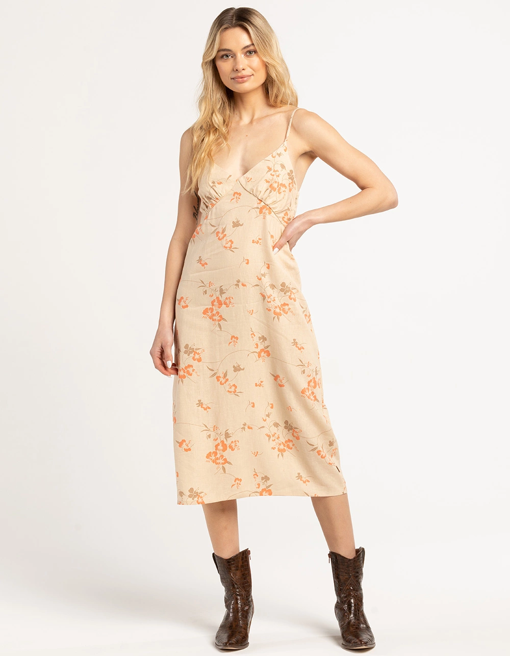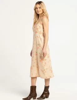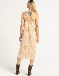 Brixton Lanai Midi Dress. Allover floral print. V-neckline. Adjustable spaghetti straps. Side seam zipper entry. Elastic back. Approx. length: 45.5”. 55% Linen, 45% Viscose. Machine wash. Imported.