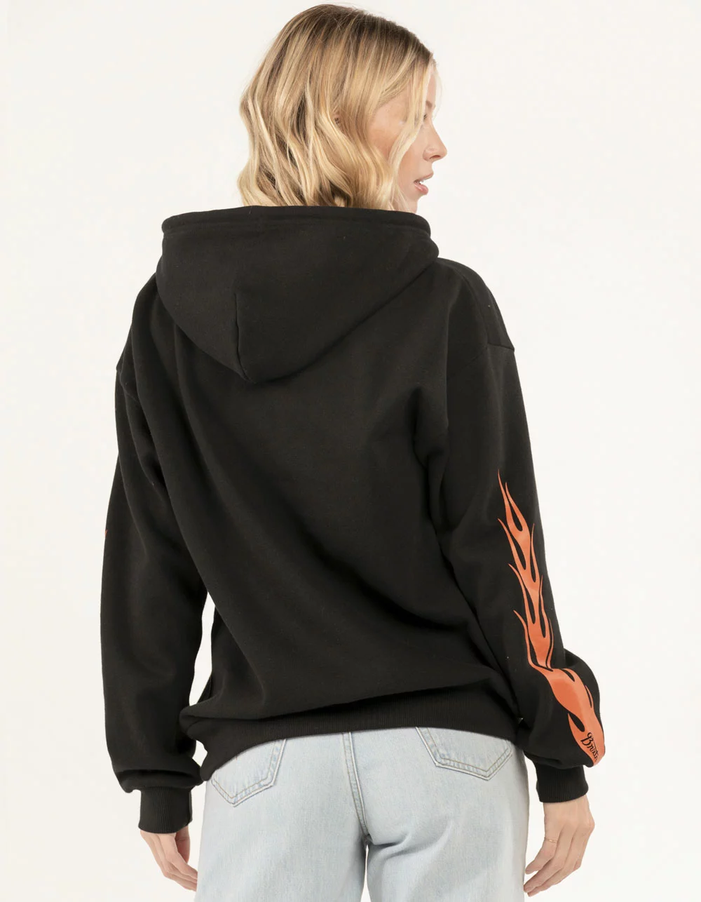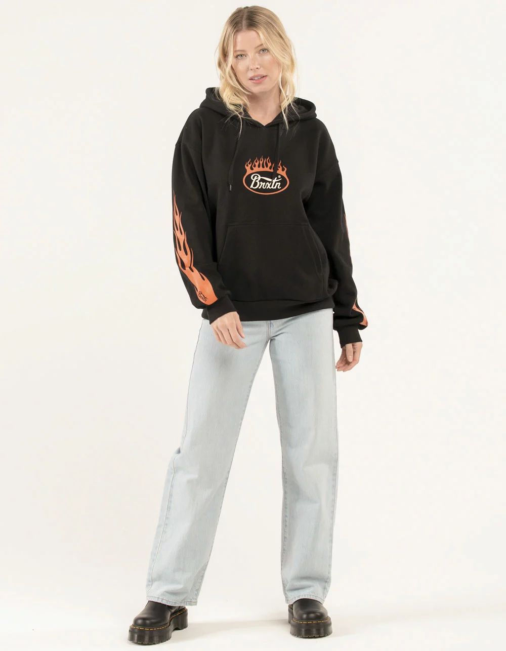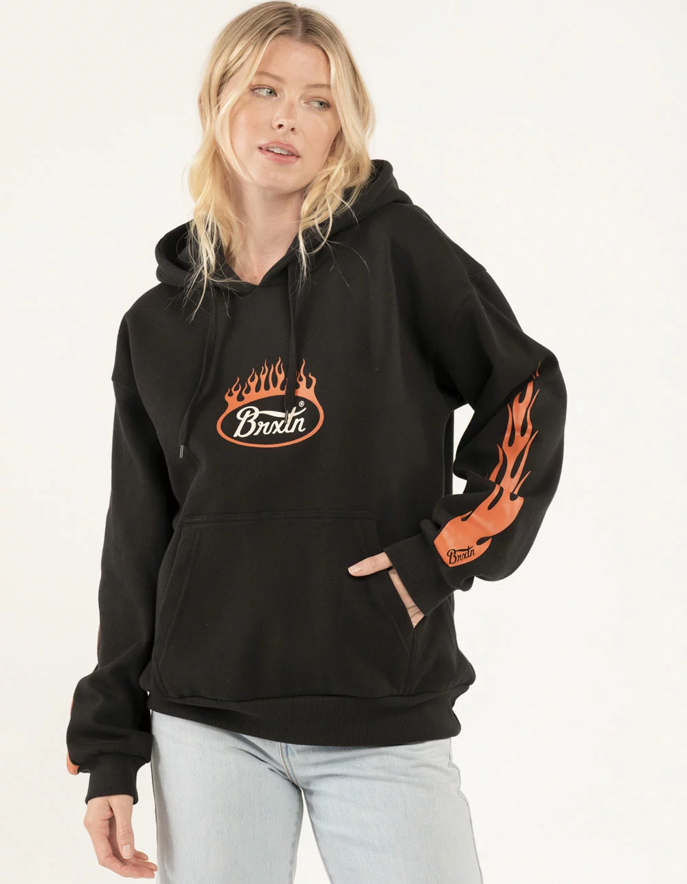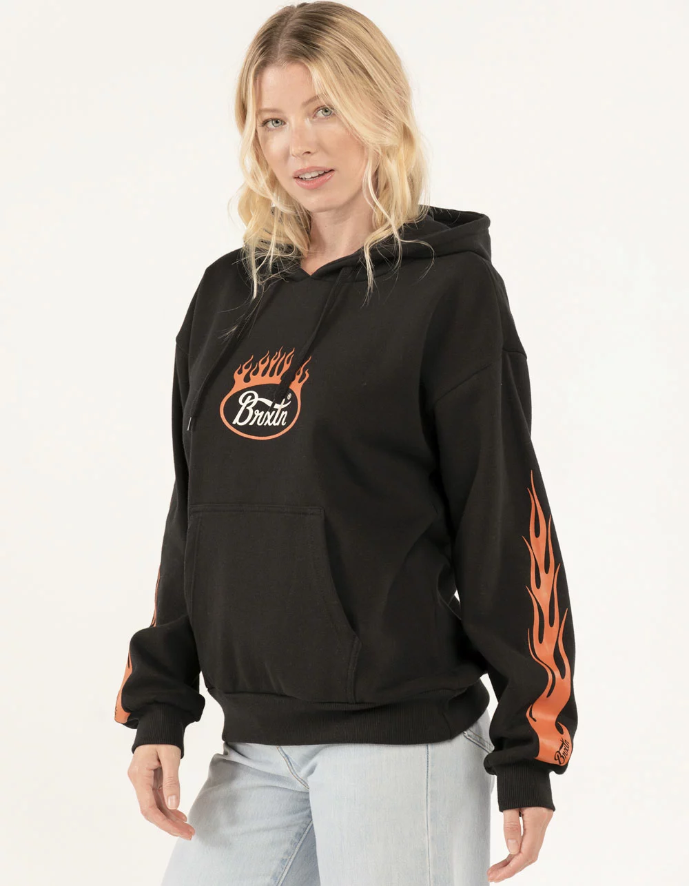 Brixton Parsons Flame Hoodie. Graphic screened at chest. Large graphics screened on sleeves. Fleece lining. Drawstring hood. Front pocket pouch. Cuffed long sleeves and hem. 77% Cotton 23% Recycled Polyester. Machine wash. Imported.