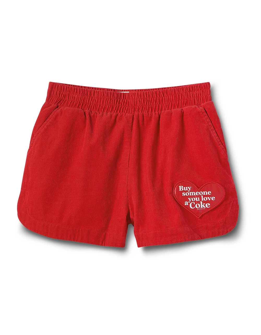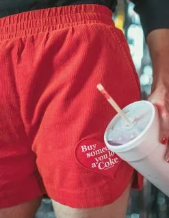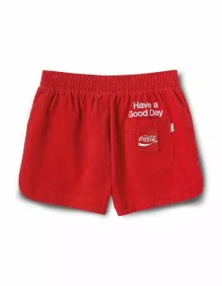 Brixton x Coca-Cola Corduroy Runner Shorts. Crafted with 100% cotton twill and finished with thoughtful scalloped hems, these vintage-inspired shorts offer an effortless fit and Coke red hue that will make you feel unstoppable. Ready to take on the day? Slip into these shorts and hit the ground running! Patch on lower left leg. Logo patch on back patch pocket. Text embroidery over back patch pocket. On seam pockets. Approximate inseam: 2.5″. Standard fit. 100% Cotton. Machine wash. Imported.