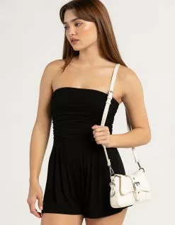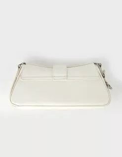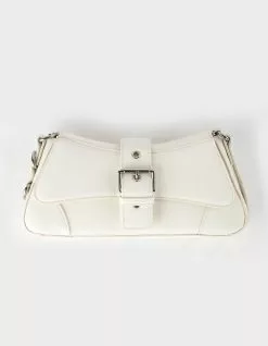 Buckle And Chain Shoulder Bag. PU leather shoulder bag featuring buckle and chain detailing. Silver toned hardware. Magnetic closure. Interior organizational pockets. Adjustable shoulder strap. 12”W x 6”L x 2”D. PU leather. 100% polyester lining. Wipe clean with a damp cloth. Imported.