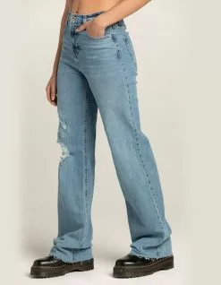 Celebrity Pink High Rise Jeans. Zipper fly with button closure. Belt loop waist. Traditional five pocket styling. Rips on right leg. Raw hem. High rise. Wide leg. Medium wash. 99% Cotton, 1% Spandex. Machine wash. Imported.