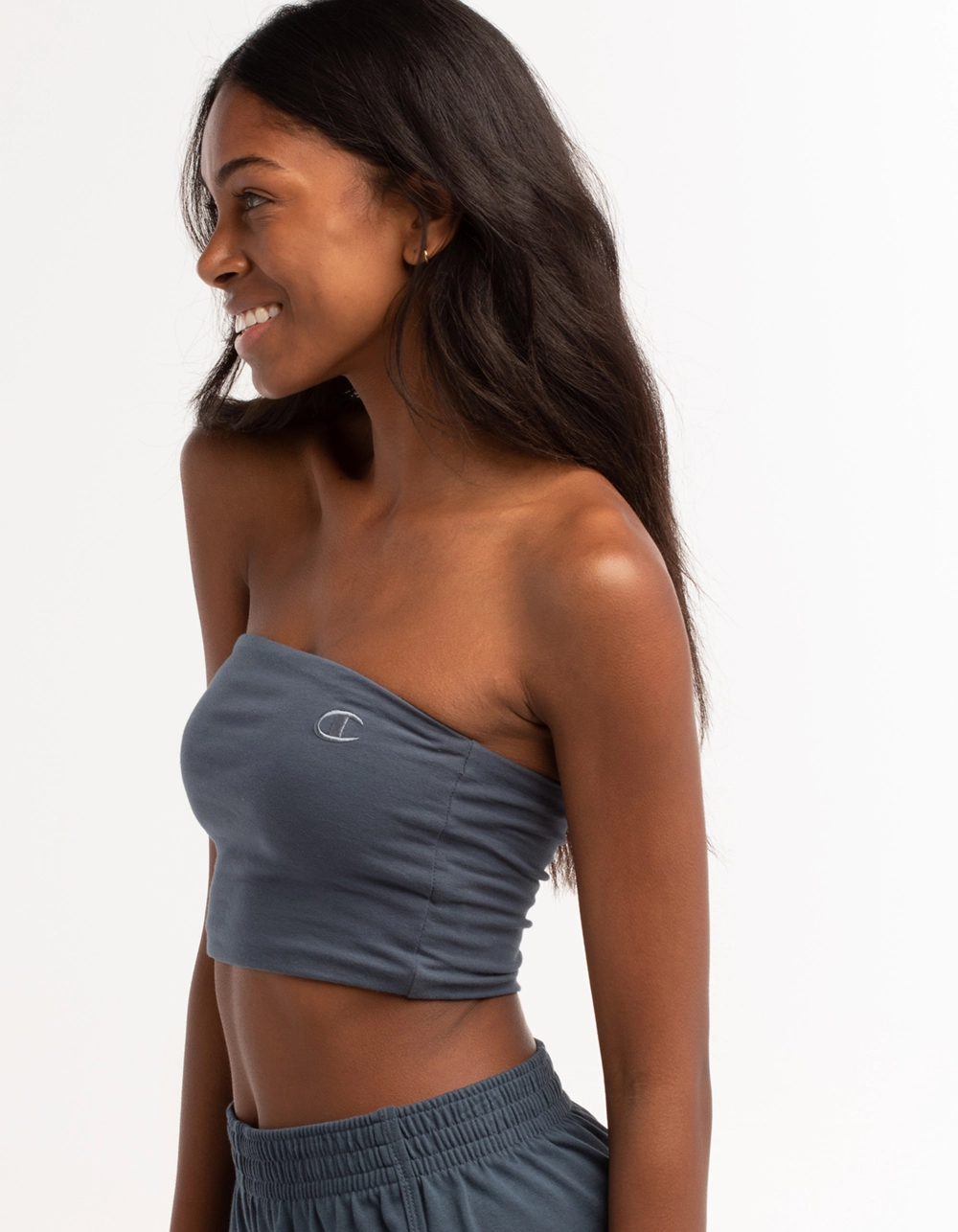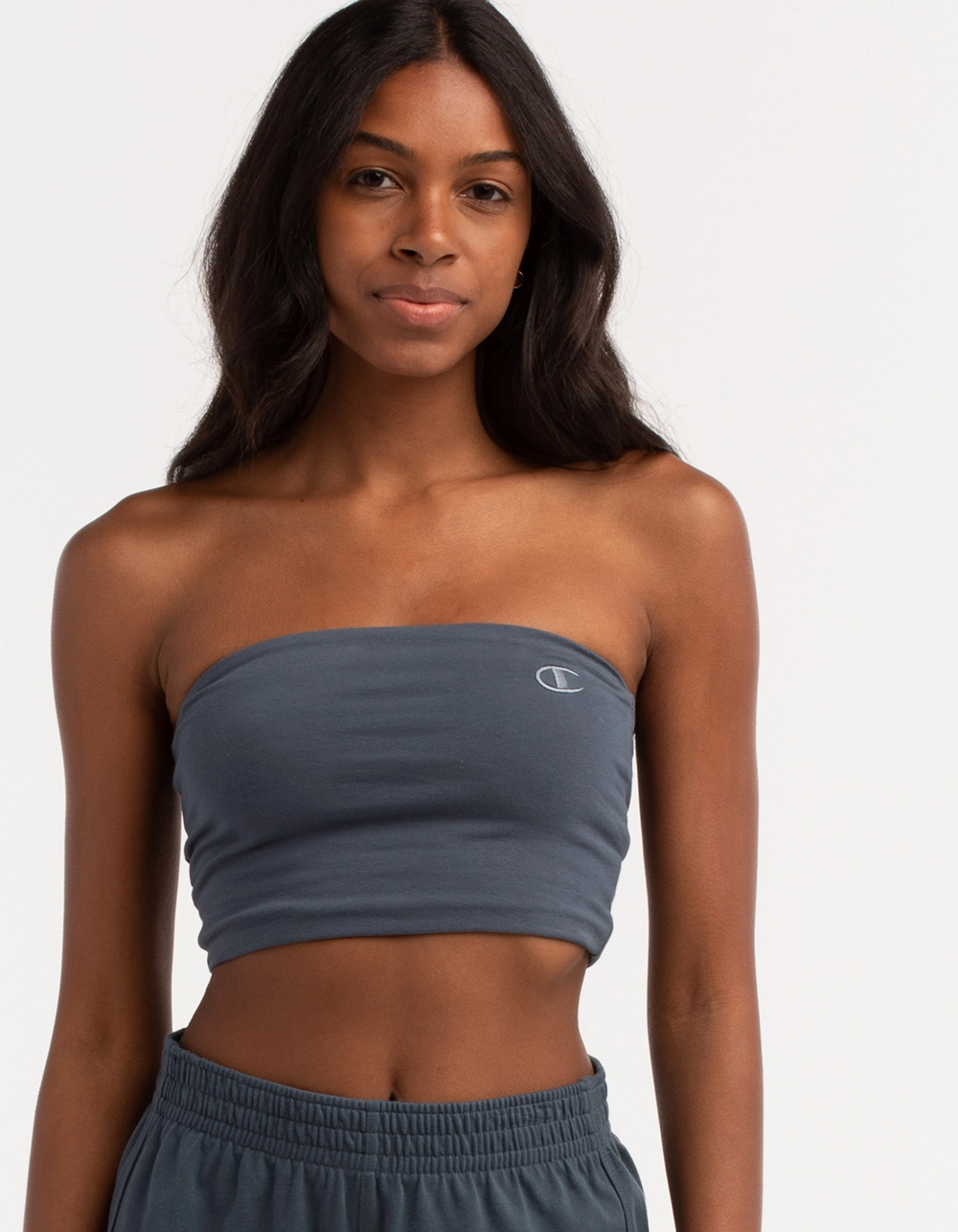 Champion Everyday C Tube Top. Solid crop tube top with stretch. Champion “C” logo patch at front left. Fitted silhouette. Double lined. 90% cotton/10% spandex. Machine wash. Imported.