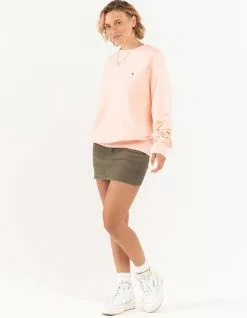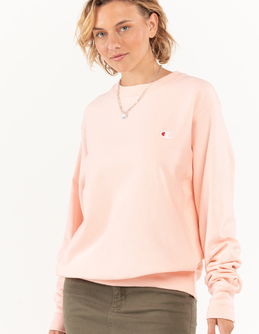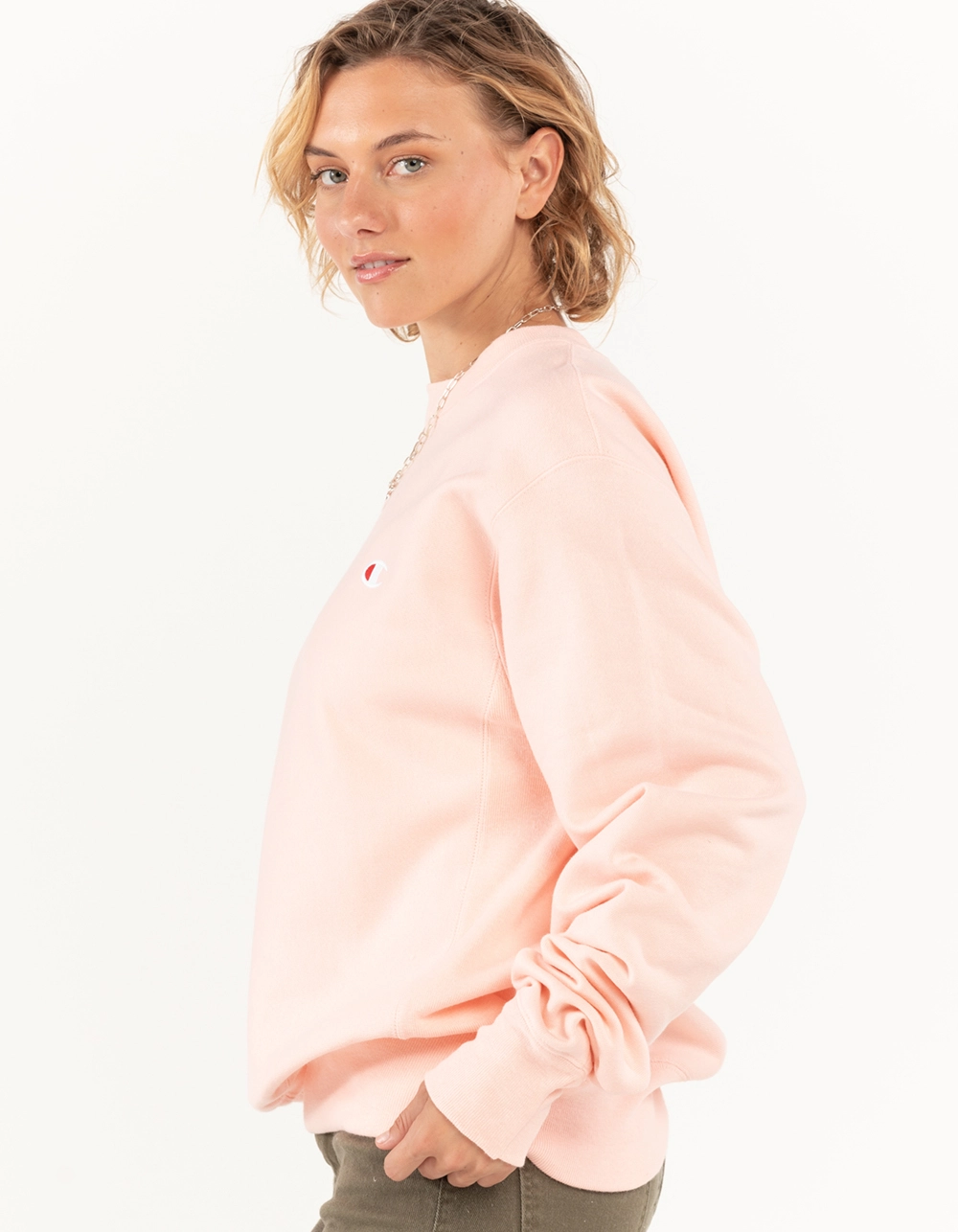 Champion Reverse Weave Oversized Crewneck Sweatshirt. Embroidery at chest. Cuffed long sleeves and hem. Ribbed crew neckline. Long sleeves. 82% Cotton 18% Polyester. Machine wash. Imported.