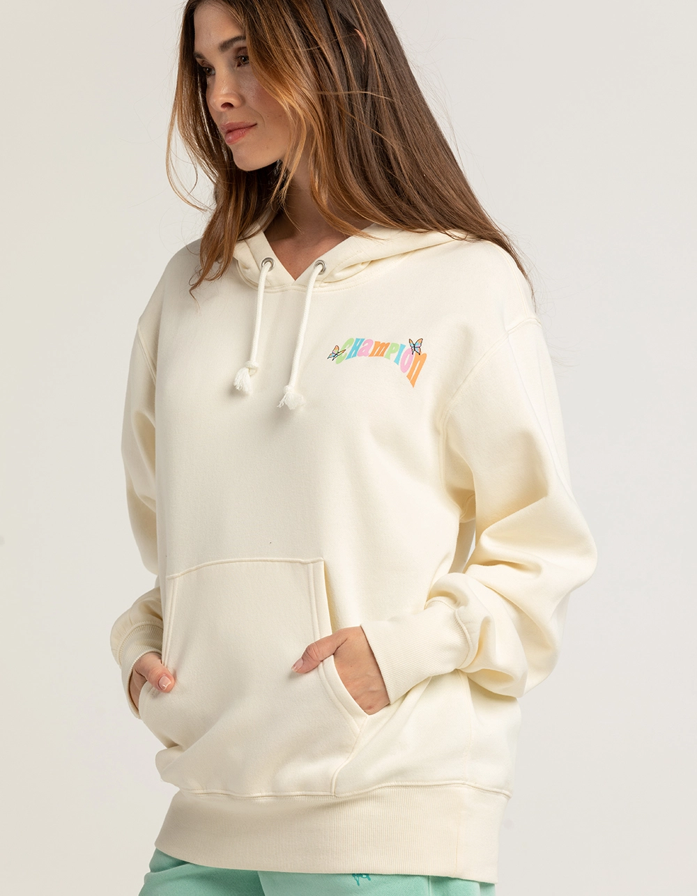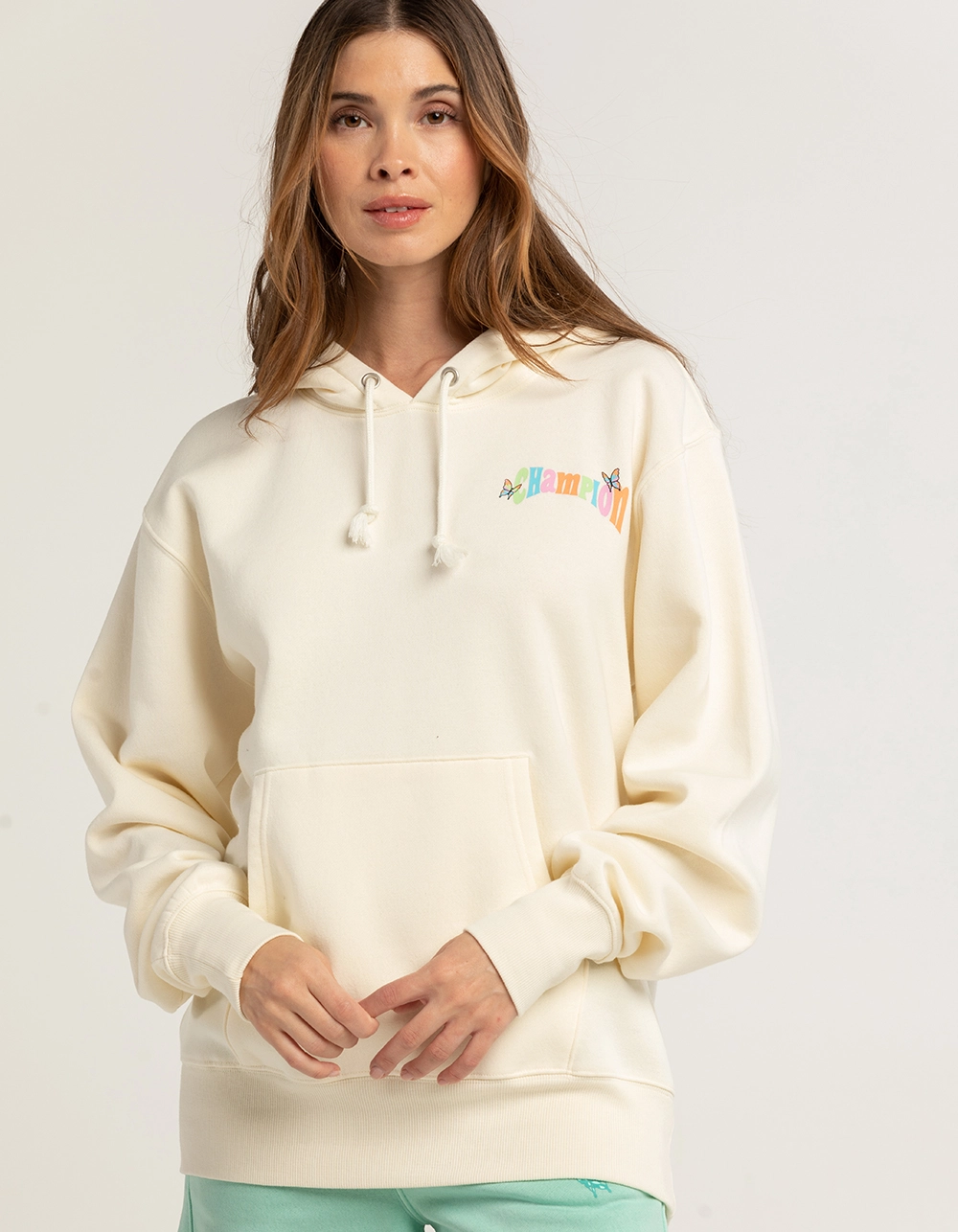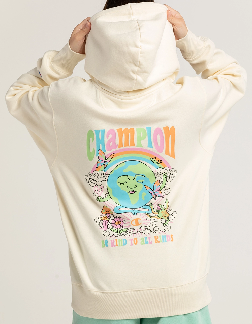 Champion Sun Dye Oversized Hoodie. Champion logo screened on left chest. Large graphic on back. Drawstring hood. Cuffed long sleeves and hem. Small Champion logo embroidery on left sleeve. Kangaroo pocket. Fleece lining. Oversized fit. 53% Cotton, 47% Polyester. Machine wash. Imported.