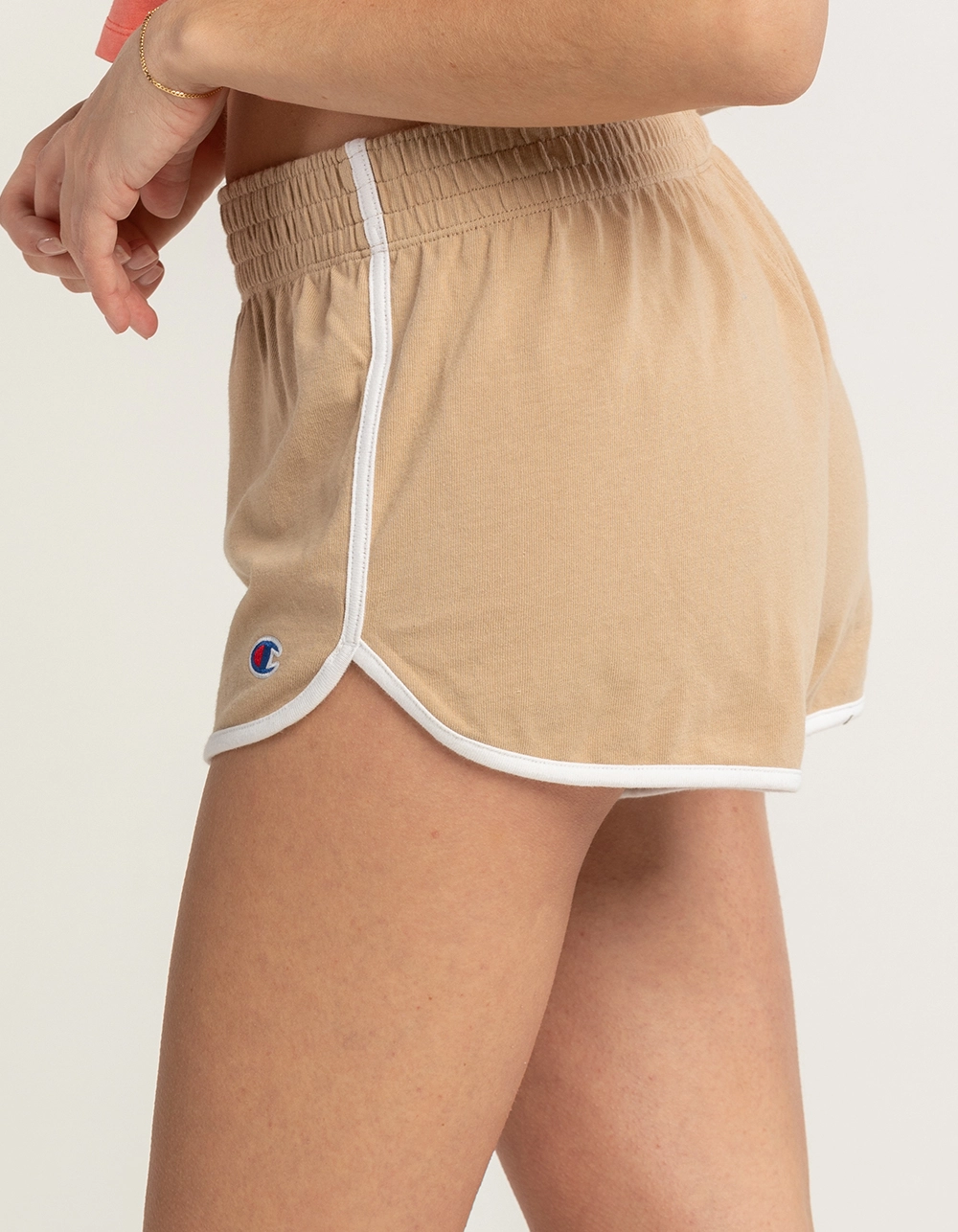 Champion 2.5” Gym Shorts. Retro-cool Gym Shorts get a soft re-make in heavyweight cotton jersey. Mid-rise elastic waistband and old school dolphin leg. Reps your sporty look styled with crop tees and fresh kicks. Classic, relaxed fit. C patch logo at left leg. Inseam: 2.5 inches. 100% Cotton. Machine wash. Imported.