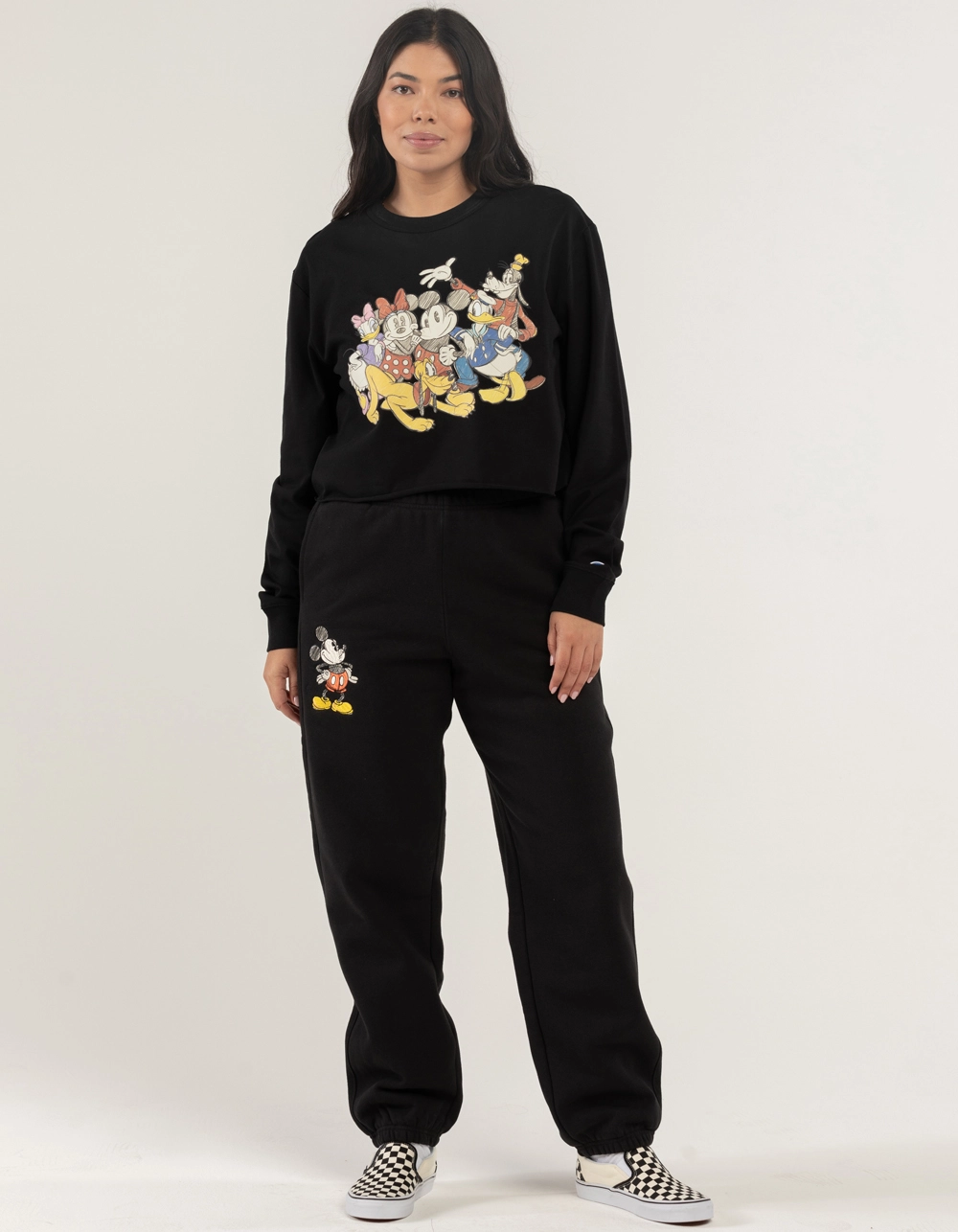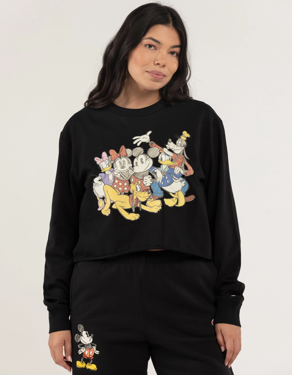 Champion x Disney Friend Tee. Graphic on front. Ribbed crew neckline. Long sleeves. Crop raw hem. 100% Cotton. Machine wash. Imported.