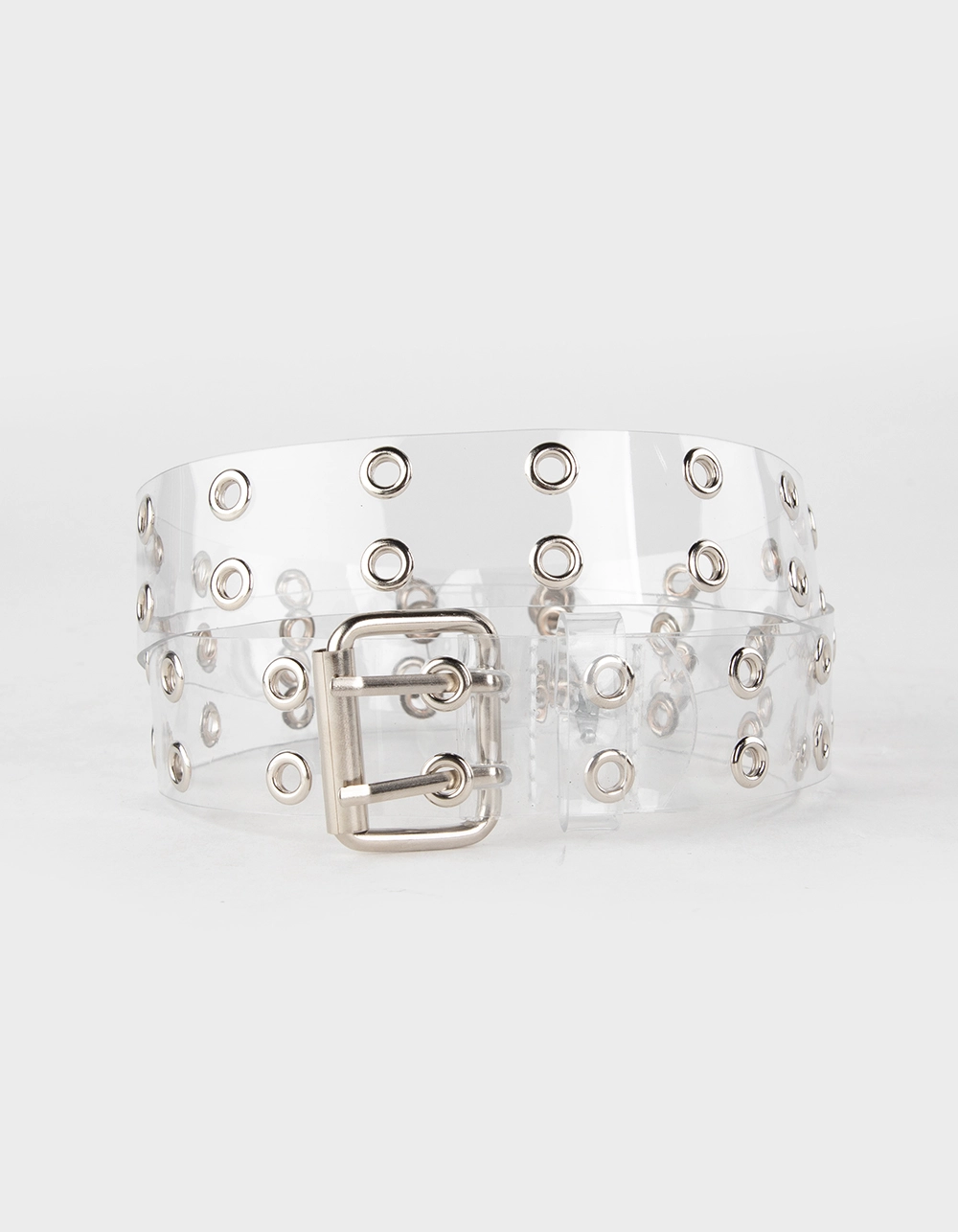 Clear Grommet Belt. Clear belt featuring a silver tone buckle and grommets. Approx. width: 1.75”.100% Polyurethane. Imported.