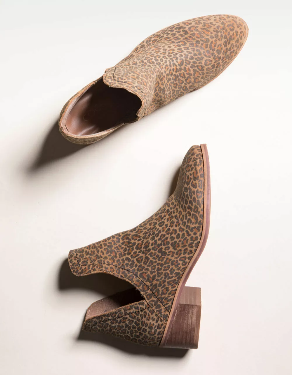 Coconuts by Matisse Rapid chop out booties. Ankle booties with deep V cut-outs at the sides. Leather upper at front with man-made structured heel. Synthetic midsole. Faux stacked heel. Rubber outsole. Approx. heel height: 2.25″. Imported.