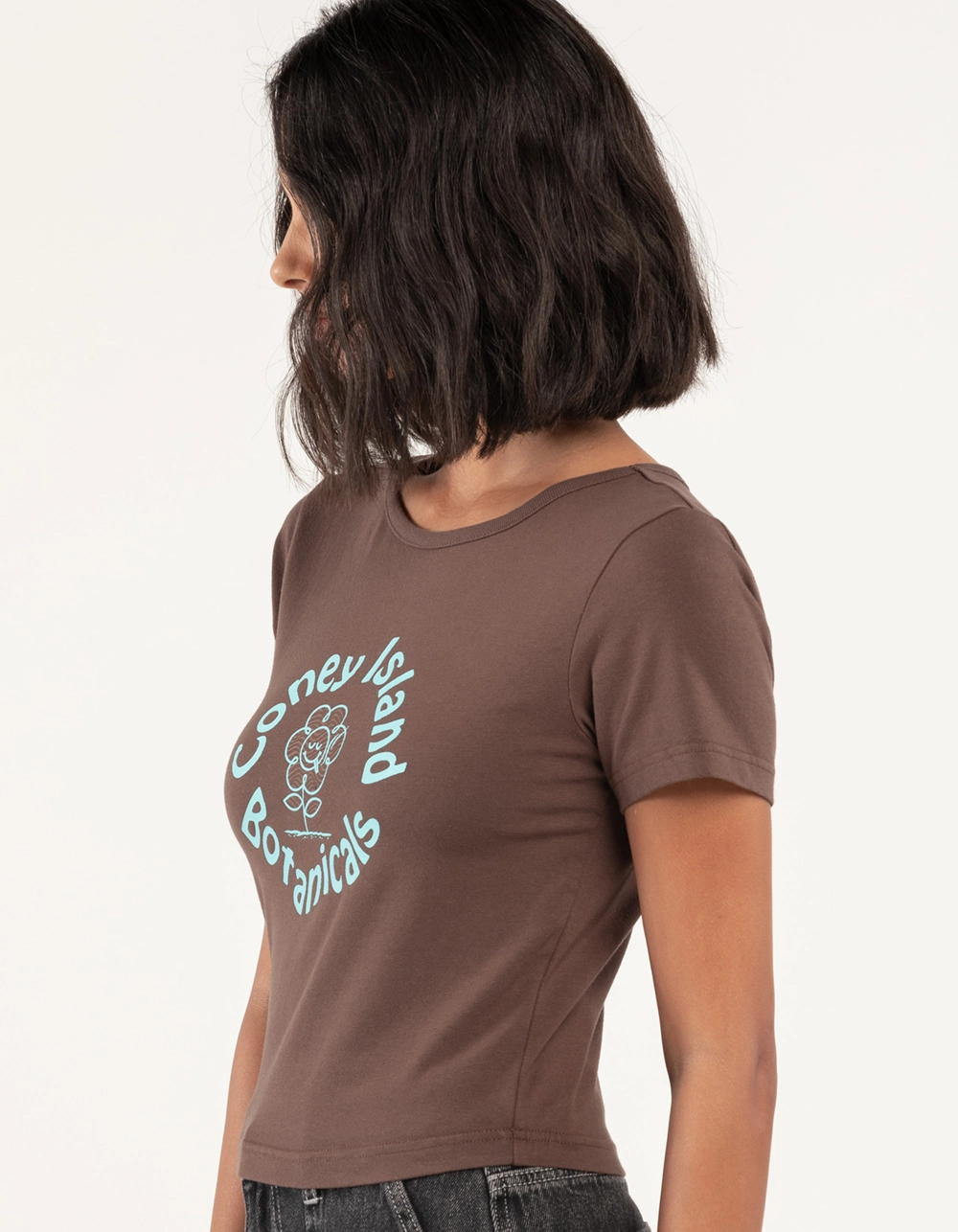 Coney Island Picnic Botanicals Baby Tee. Graphic on front. Ribbed crew neckline. Short sleeves. Baby Tee Fit. 95% Cotton 5% Spandex. Machine wash. Imported.