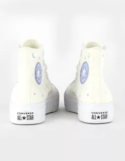 Converse Chuck Taylor All Star Lift Platform Celestial High Top Shoes. These platforms brings your look into another realm. The sun and moon inspired the joyful and vibrant vibes, while classic details help keep you grounded. Plus, OrthoLite cushioning helps keep you moving in comfort—no matter the galaxy. High-top platform with durable canvas. OrthoLite cushioning for all-day wear. Screenprinted and embroidered stars and moons on the outer and inner panels. Blue moon All Star patch. Imported.