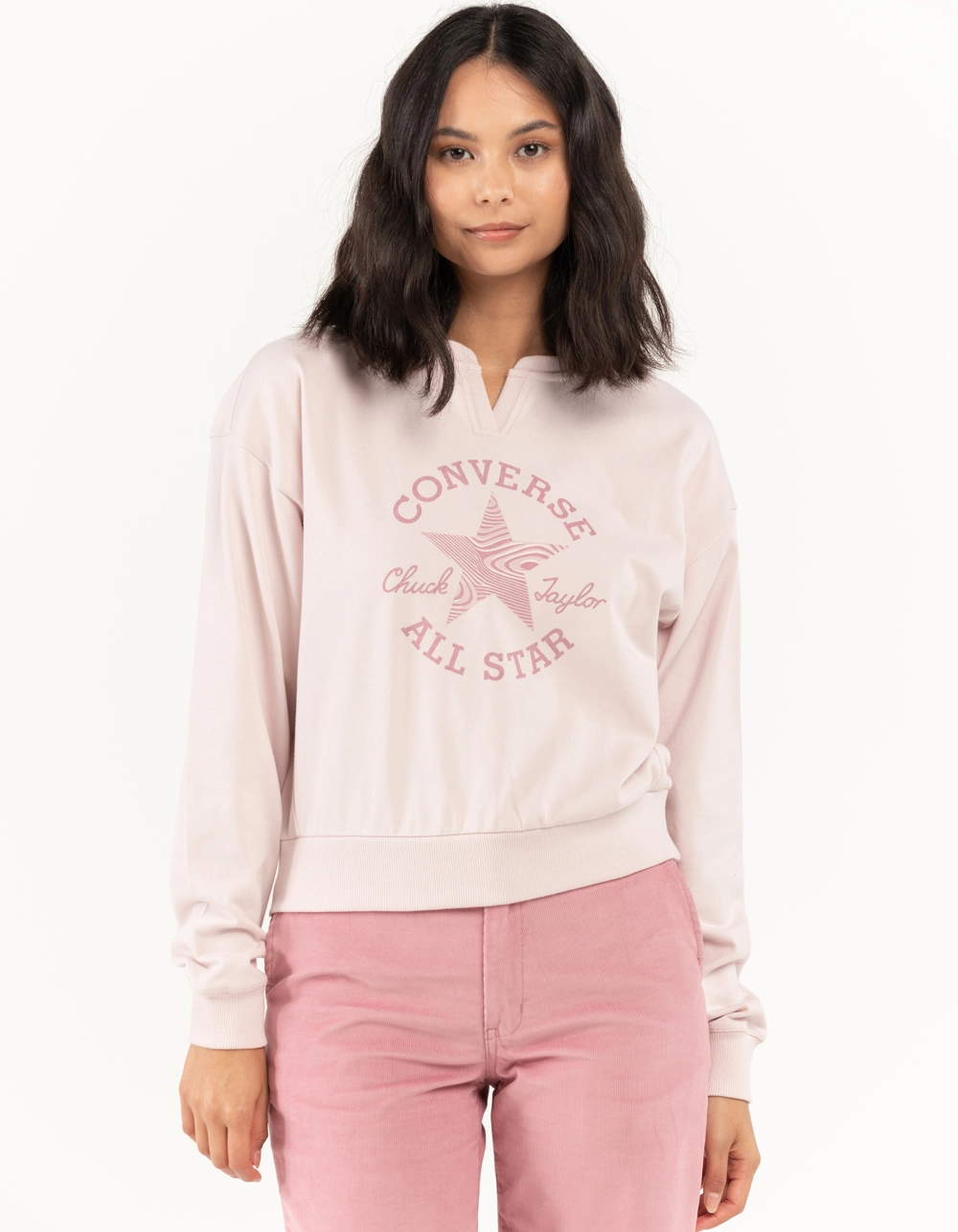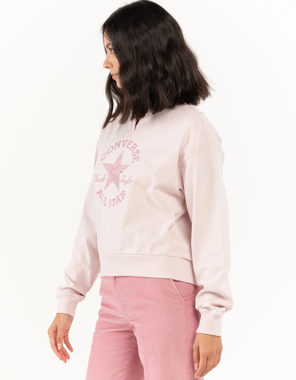 Converse Chuck Taylor Patch Womens Crewneck Sweatshirt. Graphic at chest. Cuffed long sleeves and hem. Ribbed crew neckline with split notch. Long sleeves. 100% Cotton. Machine wash. Imported.