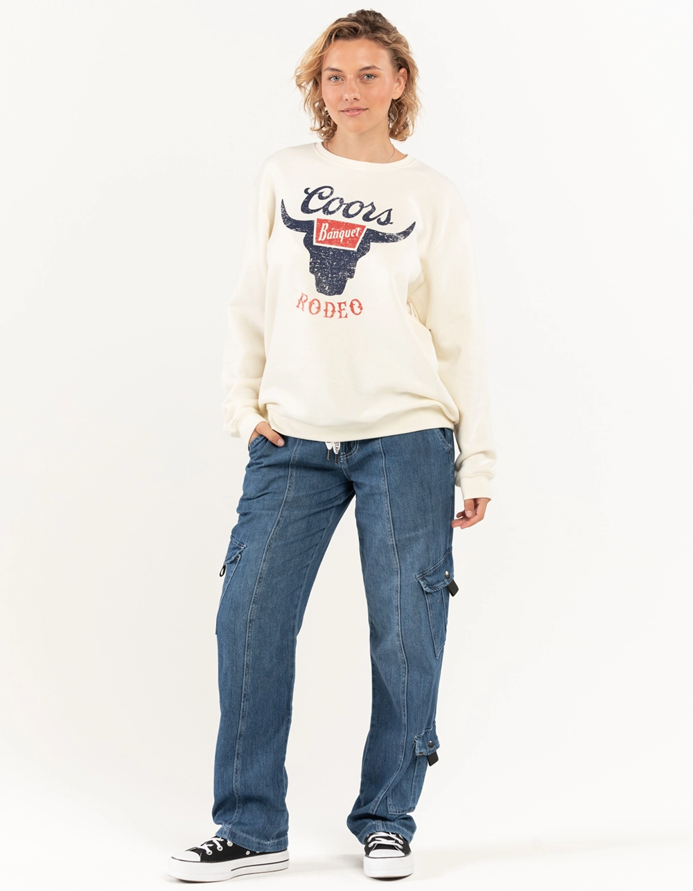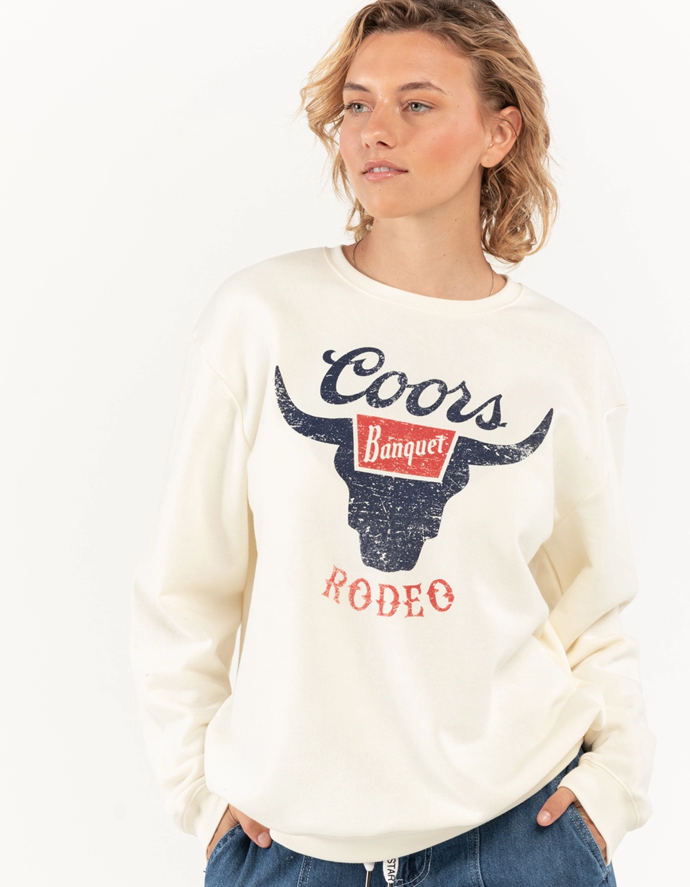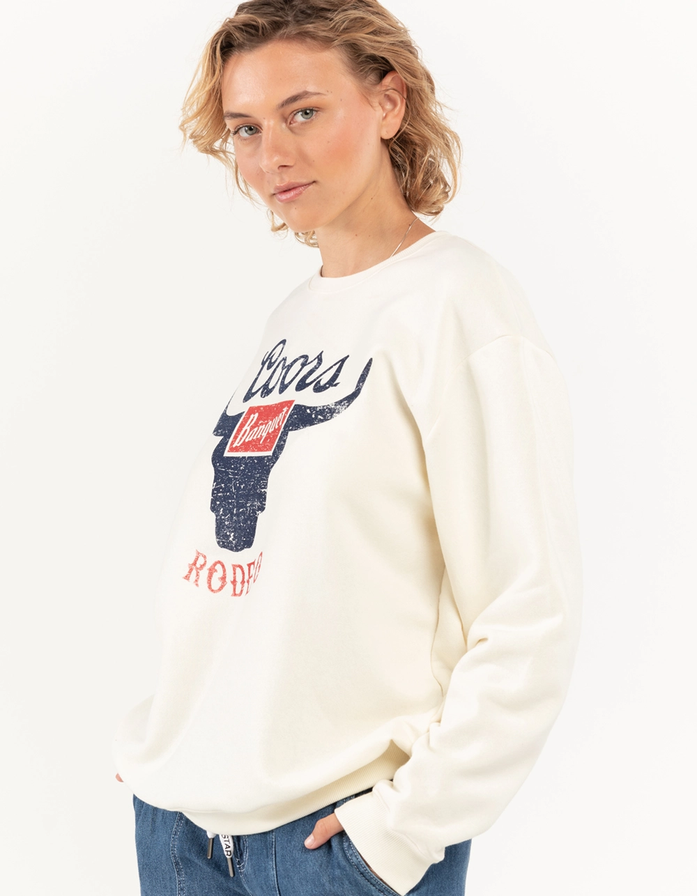Coors Rodeo Crewneck Sweatshirt. Large graphic on chest. Cuffed long sleeves and hem. Ribbed crew neckline. Long sleeves. 60% Cotton 40% Polyester. Machine wash. Imported.
