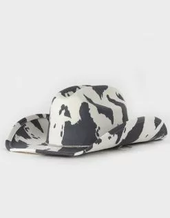 Cow Rhinestone Trim Cowboy Hat. Allover cow print. Faux suede. Cattle crease crown. Wide brim. Rhinestone hatband and chin strap. 90% Polyester, 10% Alloy. Imported.