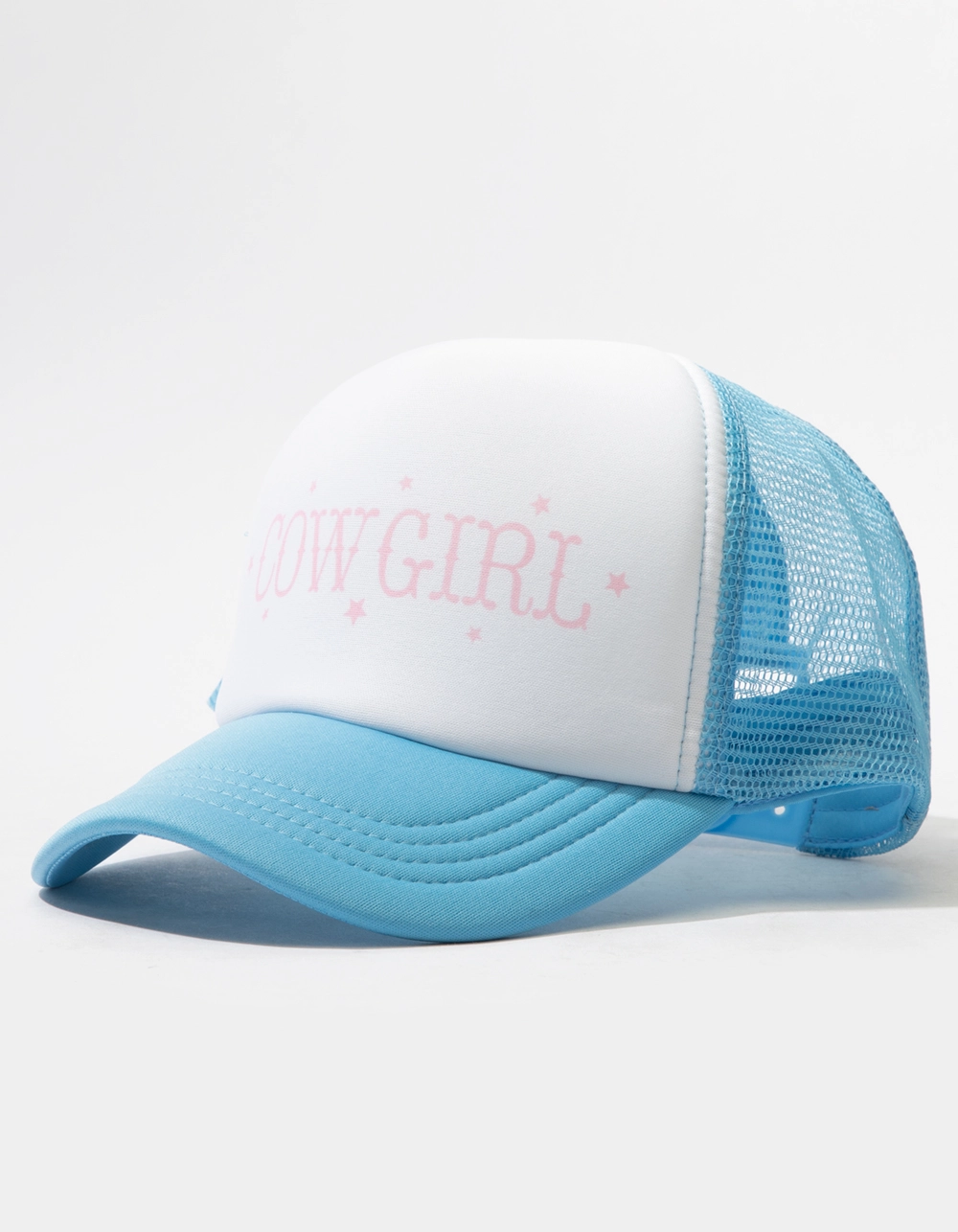 Cowgirl Trucker Hat. Patch at front. Cushioned front panel. Mesh back. Adjustable snapback. Woven Label on closure. 100% Cotton. Imported.