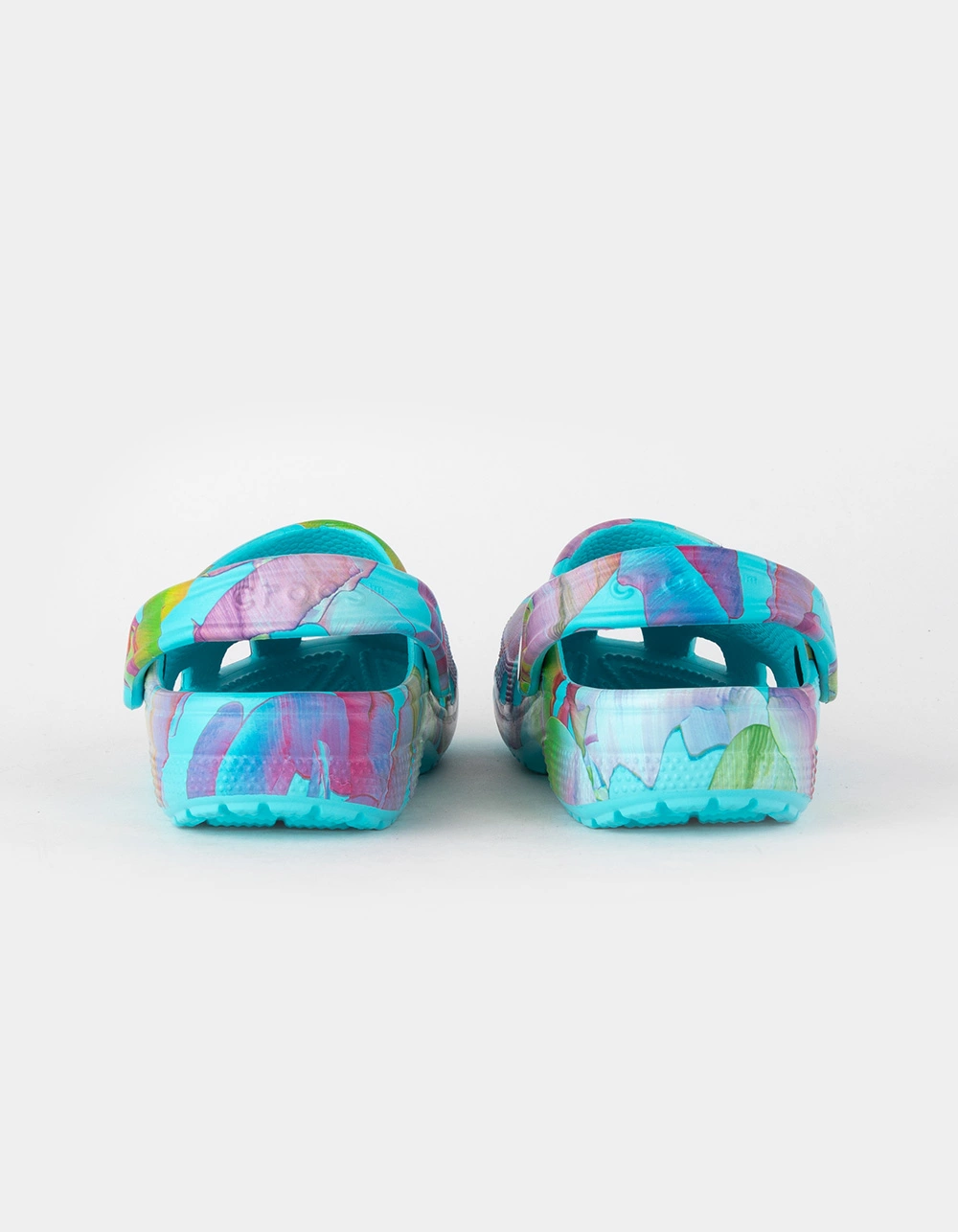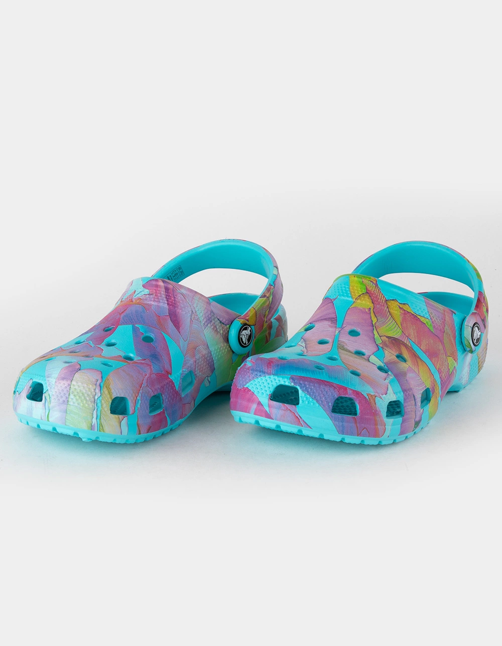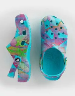 Crocs Palm Print Classic Clogs. A distorted palm-tree inspired print provides extra style to this version of the iconic clog. The stylish palm print helps you show off your creative spirit, and Croslite™ foam construction keeps them light and easy to wear. Grounded in comfort, spiked with personality. Incredibly light and fun to wear. Ventilation ports add breathability and help shed water and debris. Pivoting heel straps for a more secure fit. Customizable with Jibbitz™ charms. Lightweight. Flexible. 360-degree comfort. Imported.