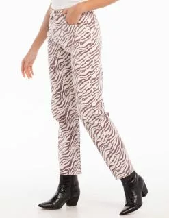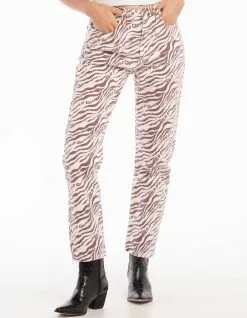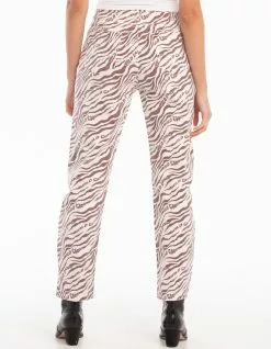 Daisy Street Zebra Dad Jeans. All over print. Belt loop waist. Button closure paired with zipper fly. Basic 5 pocket design. High waist. Straight leg. Approx. inseam: 28″. 100% Cotton. Machine wash. Imported.
