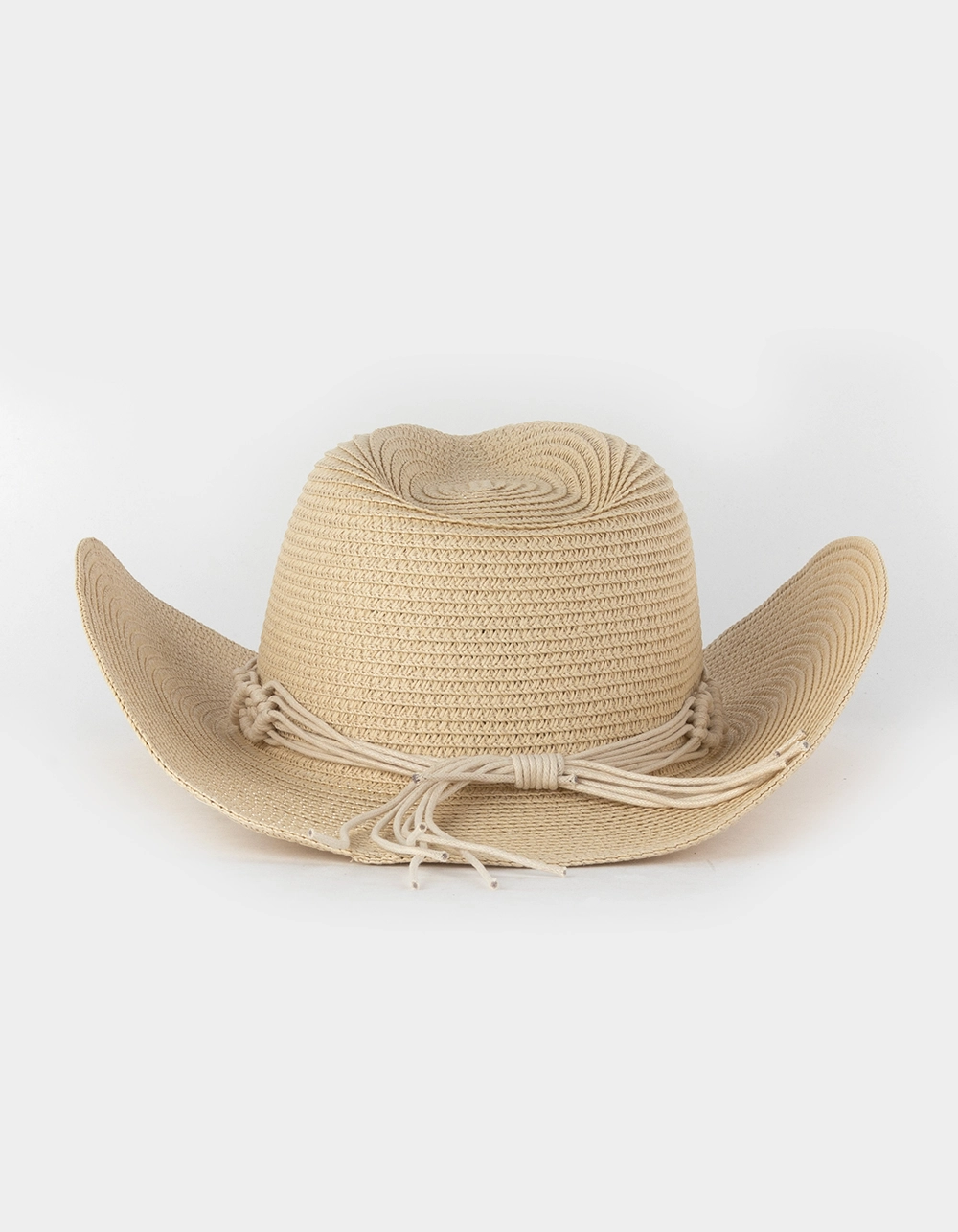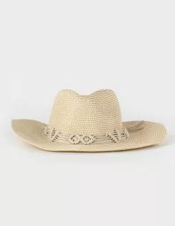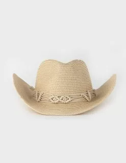 Crochet Trim Packable Cowboy Hat. High crown with pinch front. Wide brim. Crocheted hatband. Elastic band in the interior of the hat. Packable and made to fit in luggage. 80% Paper. 20% Polyester. Spot clean with a damp cloth. Imported.
