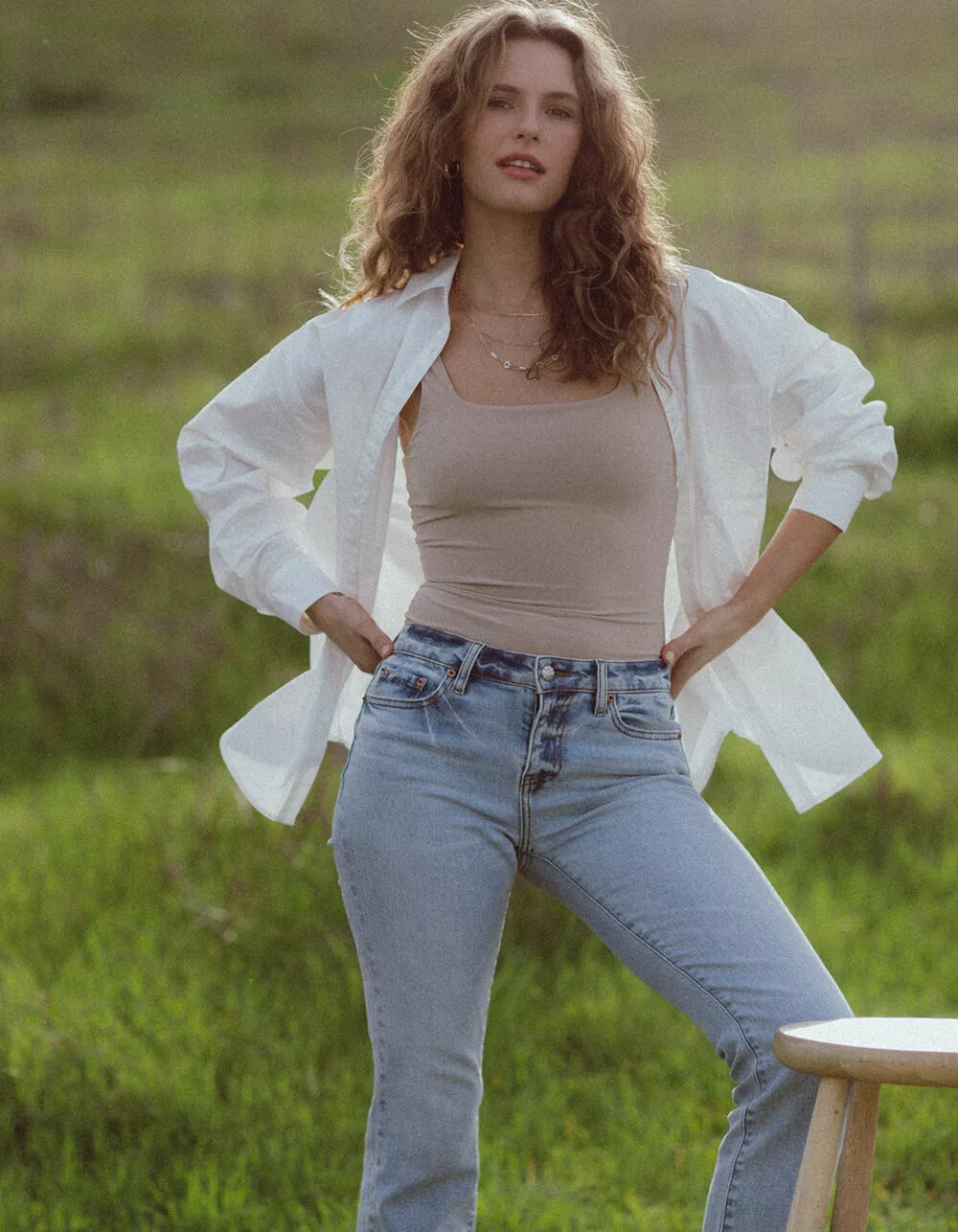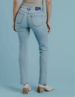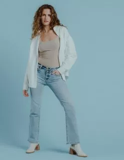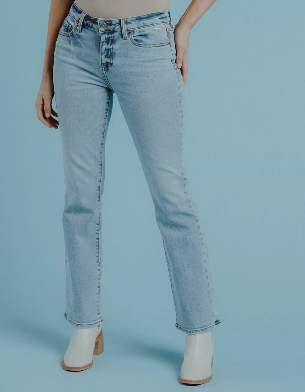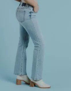 Daze Low Rise Y2K Bootcut Jeans. Zipper fly and button closure. Belt loop waist. Traditional five pocket styling. Slight distressing near front pockets. Light wash. Flared pantleg. Approx. inseam: 31”. 93% Cotton, 5% Polyester, 2% Spandex. Machine wash. Imported.
