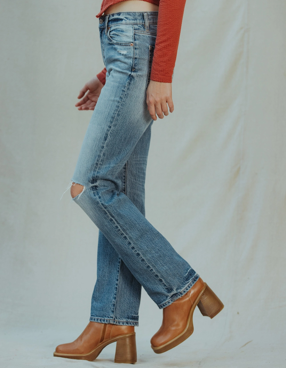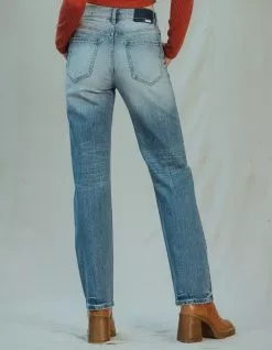 Daze Denim Sundaze High Rise Dad Jeans. Zipper fly with button closure. Belt loop waist. Traditional five pocket styling. Rips on knees. High rise. Approx. inseam: 30.5”. 65% Cotton, 34% Organic Cotton, 1% Elastane. Machine wash. Imported.