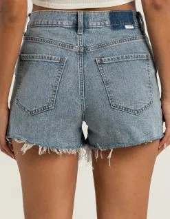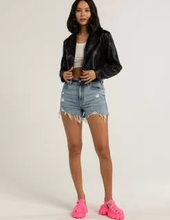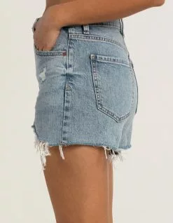 Daze Denim Troublemaker Shorts. Zipper fly with button closure. Belt loop waist. Traditional five pocket styling. Distressing throughout. Frayed hem. High rise. Approx. inseam: 3.25”. Light wash. 65% Cotton, 34% Organic Cotton, 1% Elastane. Machine wash. Imported.