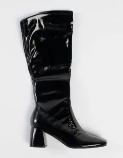 Delicious Brambles Boots. Patent leather. Square toe. Stitch details. Block heel. Textured sole. Lightly cushioned insole. Heel Height: 2″. Imported.