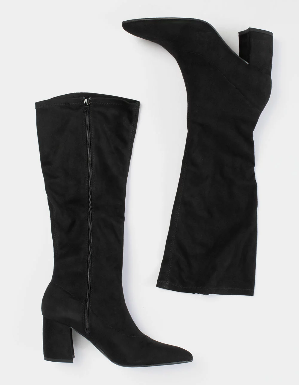 Delicious Variety Knee High Boots. Pointed toe. Side zip closure. Synthetic materials. Block heel. Approx. Heel height: 3″. Imported.