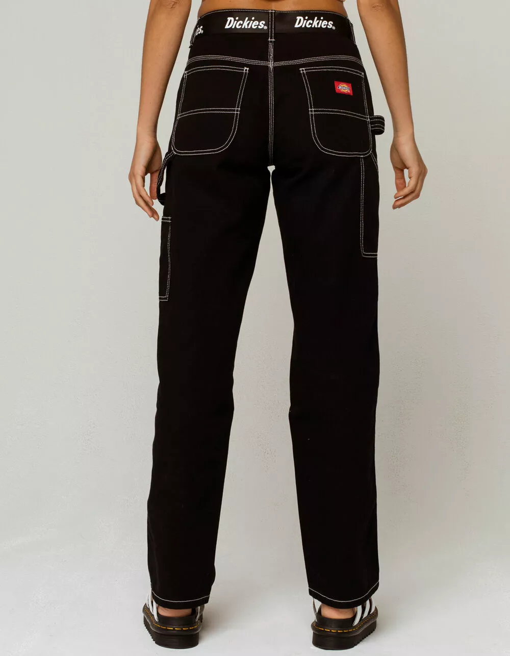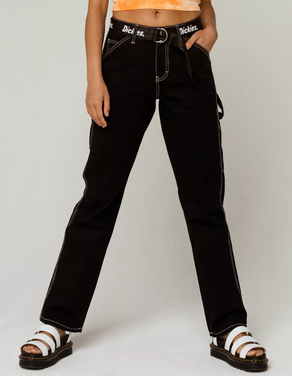 Dickies Belted Carpenter Pants. Cotton twill pants with contrast stitching. Straight leg fit. High rise waist. Removable web belt with allover Dickies logo. Slant hand pockets. Dual back patch pockets. Side utility pockets. Side tabs. Approx. inseam: 32″. Approx. rise: 10″. 100% cotton. Machine wash. Imported.