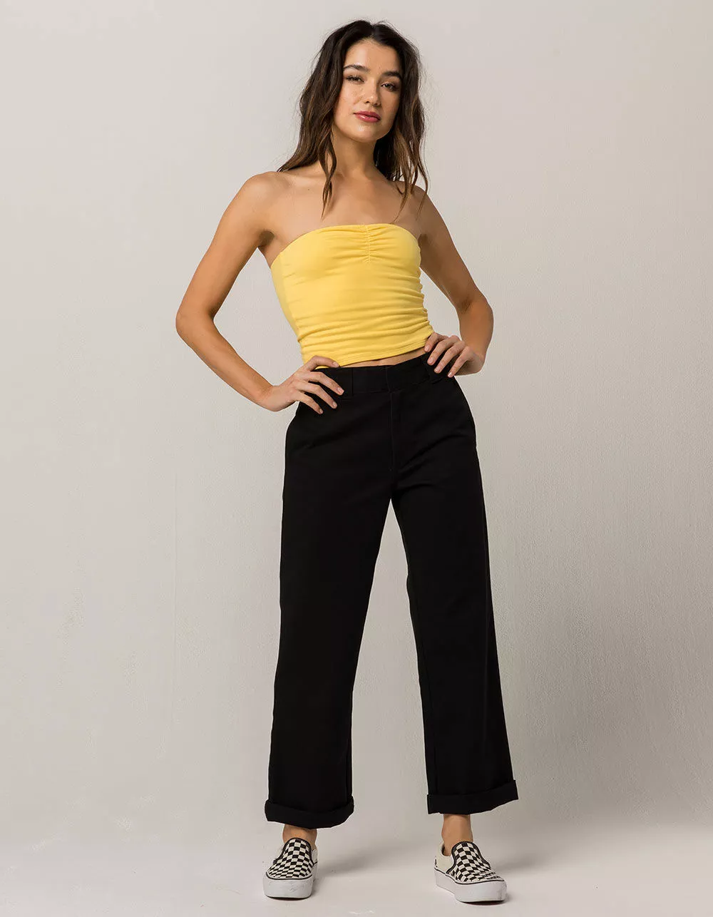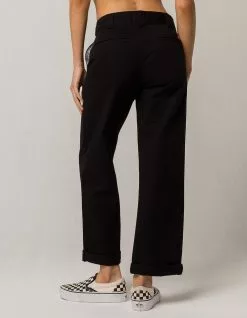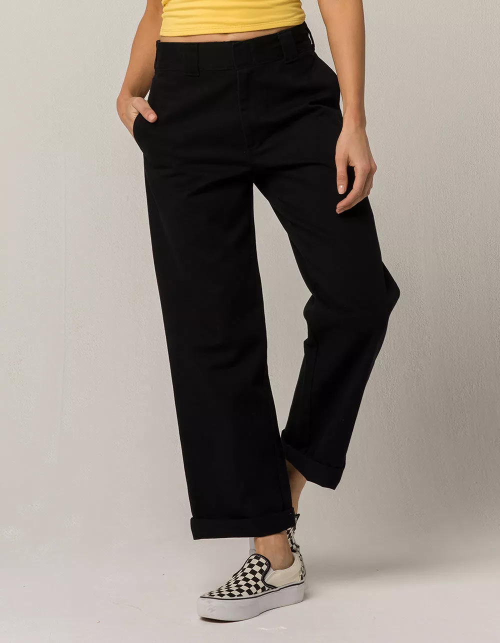 Dickies Roll Cuff crop pants. Chino inspired twill pants. Dickies label above back right welt pocket. Slant welt hand pockets. Relaxed fit. Optional roll cuff leg openings. Metal hook waist. Zip fly. Approx. inseam: 26″. 60% cotton/40% polyester. Machine wash. Imported.