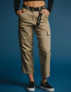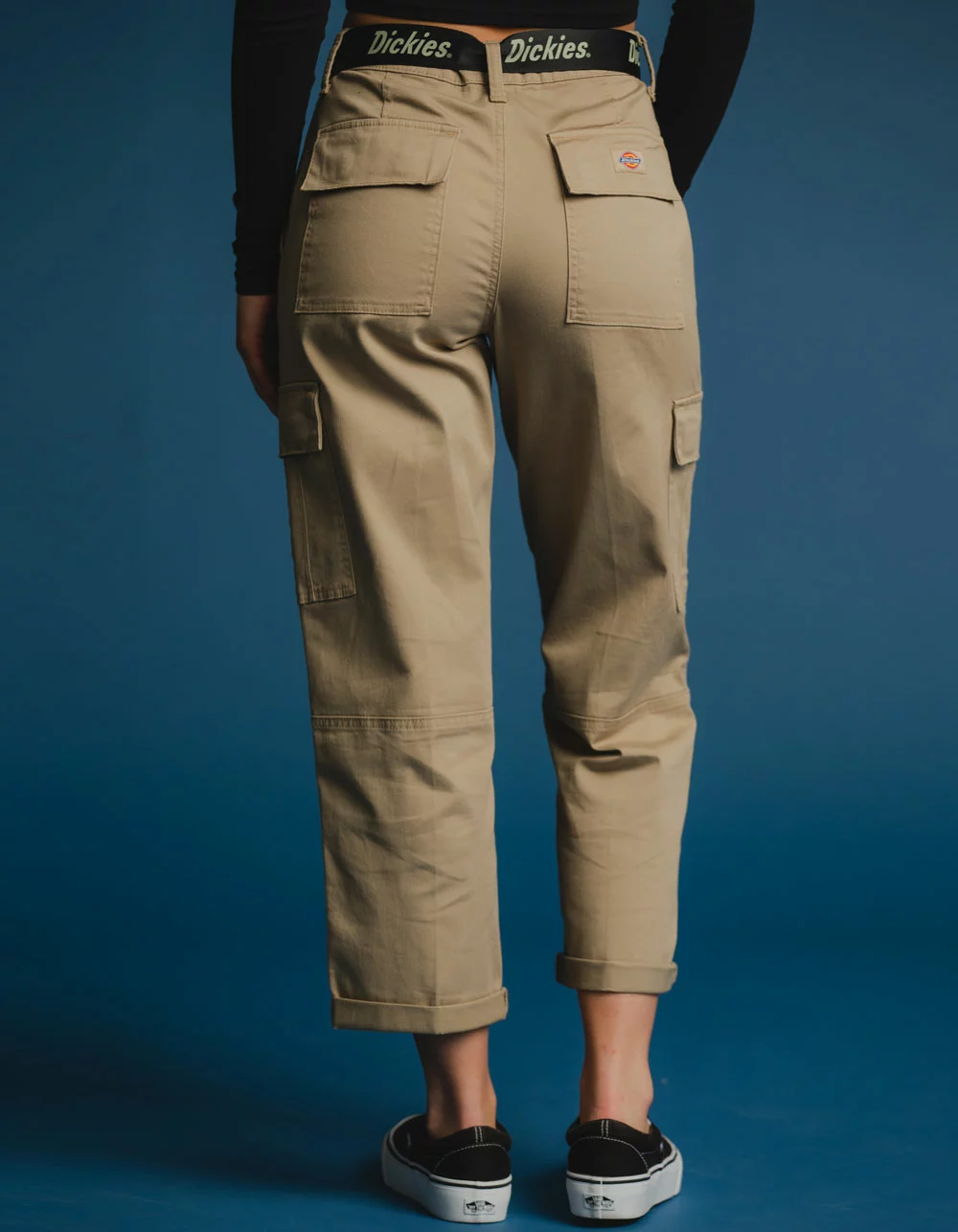 Dickies Roll Cuff Cargo Pants. Belted attached at wasit. Button front. Zip fly. Cargo pockets on sides. Slant hand pockets. Back patch pockets. Hook and loop closures. Approx. Inseam: 27.5″ 98% Cotton 2% Spandex. Machine wash. Imported.