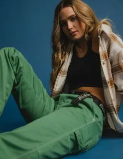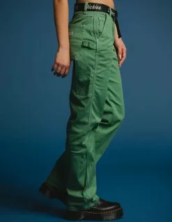 Dickies Belted Carpenter Pants. Cotton twill pants with contrast stitching. Straight leg fit. High rise waist. Removable web belt with allover Dickies logo. Slant hand pockets. Dual back patch pockets. Side utility pockets. Side tabs. Approx. inseam: 32″. Approx. rise: 10″. 98% Cotton 2% Spandex. Machine wash. Imported.