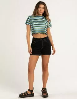 Dickies Stripe Baby Tee. This casual striped women’s t-shirt offers a slim fit silhouette and cropped length that’s easy to style with Dickies overalls and high-waisted styles. The fitted t-shirt is finished with a merrowed hem and sleeve detail. 97% Cotton, 3% Spandex. Machine wash. Imported.