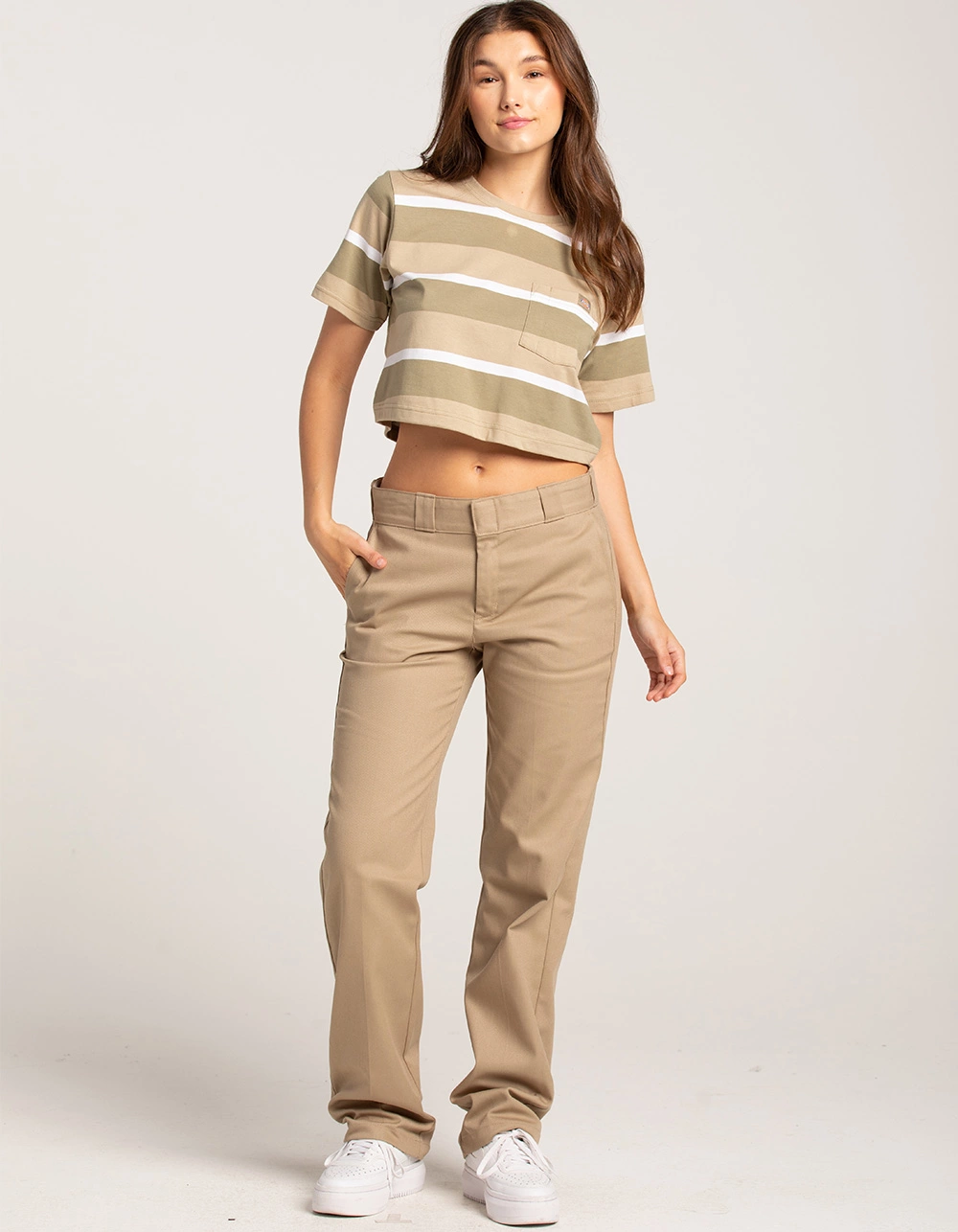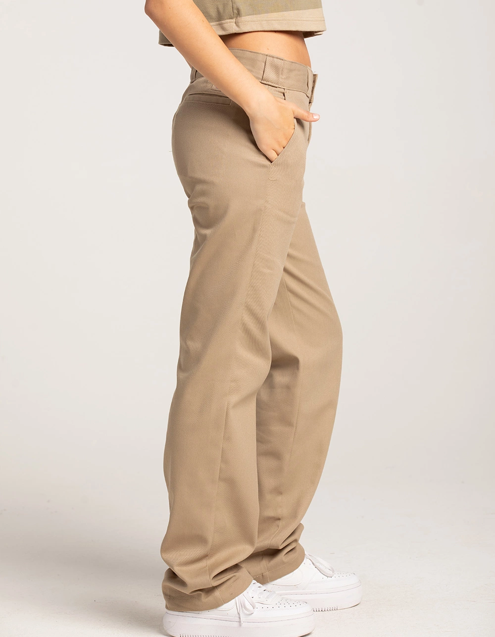 Dickies Work Pants. Widely known and universally accepted by the makers who shape our tomorrow, Dickies Women’s 774® Work Pants combine the precise combination of function and durability that enable purpose and creativity in work, daily life and beyond. Designed with a feminine fit in mind, these sturdy work pants fit straight through the hip and thigh and offer a durable cotton/poly blend that resists wrinkles and defends against stains. Ceaseless function is offered through two front side slash pockets as well as two perfectly placed rear welt pockets. Performance driven and ready to stand up to the toughest tasks, you’ll find comfort in the trusted Dickies Women’s 774® Work Pants time and time again. Straighter fit through hip and thigh; sits below waist.Dickies iconic rigid fabric – unwashed no stretch.Wrinkle resistant and Easy-care stain release. Two front side slash pockets, two welt back pockets. Ratcheting brass zipper. 8.5 oz. Twill, 65% Polyester/35% Cotton. Machine wash. Imported.
