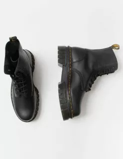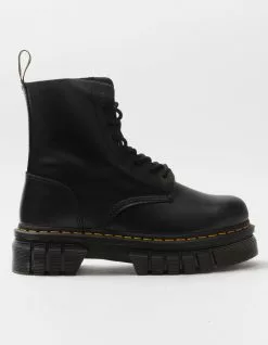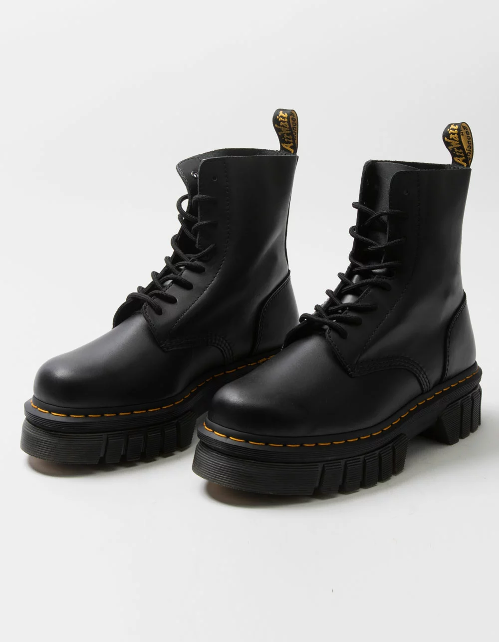 Dr. Martens Audrick 8-Eye Boots. A towering platform. With everyday wearability. These newly-evolved boots pack all the height of our renowned Quad platform into a cutting-edge lightweight construction. Set on an innovative two-part sole — a lightweight EVA midsole and PVC outsole with rugged deep cleats — they bring less weight and more attitude. DM’s at full volume. The boots are marked with all our signature DNA, including an amped-up edition of our unmistakable DMS tread pattern, as well as yellow welt stitching and a scripted AirWair heel loop. Lightweight platform sole. Nappa Lux is a classic nappa leather — soft and smooth to the touch. Our Goodyear-welted lines are heat-sealed at 700°C and reinforced with our signature welt stitch. Platform height: 1 1/2″; Heel height: 1 7/8″. Imported.