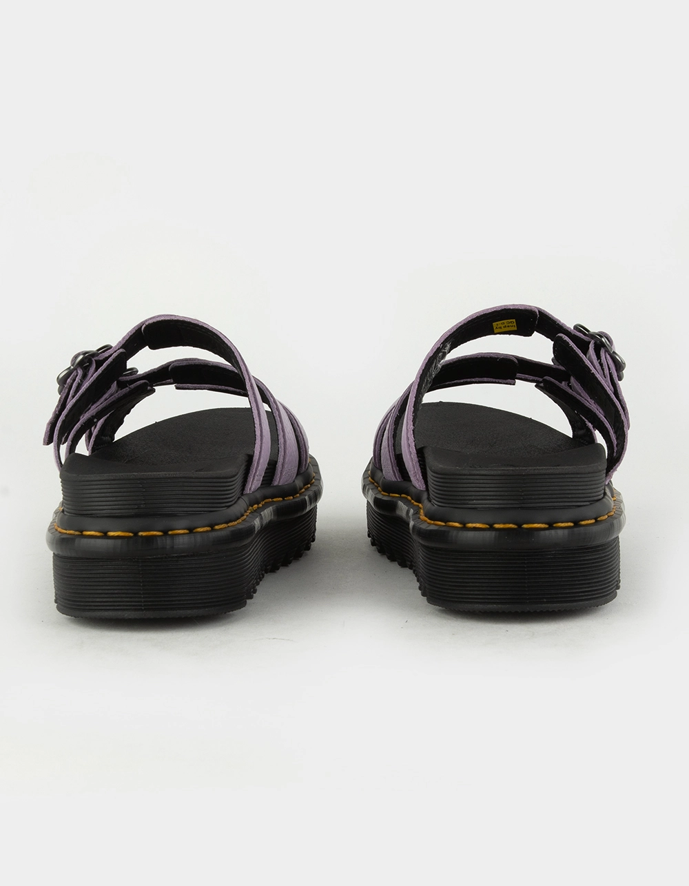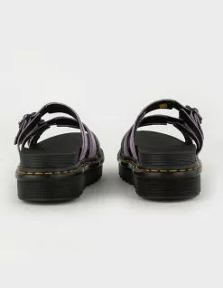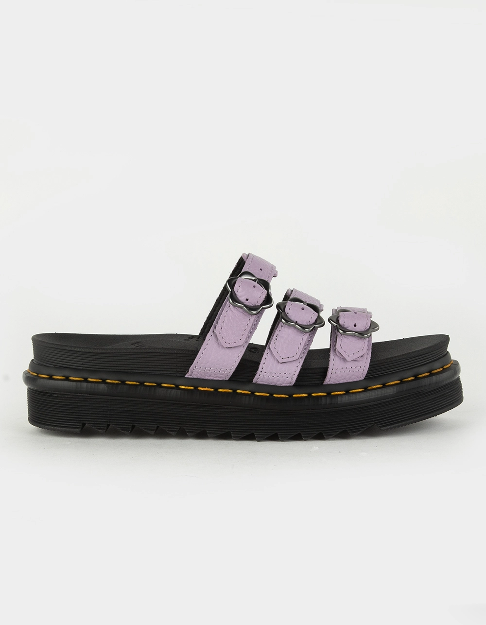 Dr. Martens Blaire Flower Buckle Slide Sandals. The 3-strap Blaire Slide is our sun-ready slip-on. In eye-catching bold lilac bringing color to even the brightest days. Built from Milled Nappa, a soft leather with a tumbled texture. Fitted with adjustable flower buckles in contrast gunmetal. A lightweight 1 7/8 inch Zebrilus sole provides an extra boost. Securely welted together with our iconic yellow stitch. Designed for those who want the wildest summers. Imported.