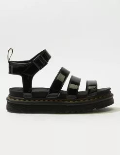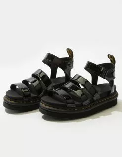 Dr. Martens Blaire Patent shoes. Blaire is our latest spin on the gladiator: an airy Dr. Martens sandal with a slight wedge for height, a padded collar for comfort, a lightweight ripple sole and — unlike most sandals — a sturdy, durable Goodyear welt.