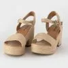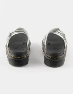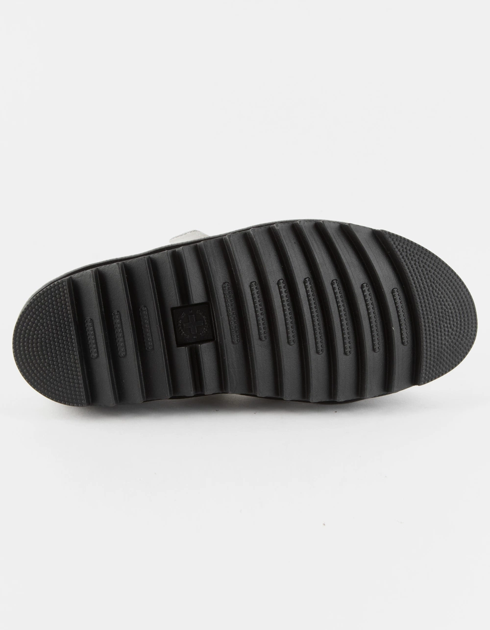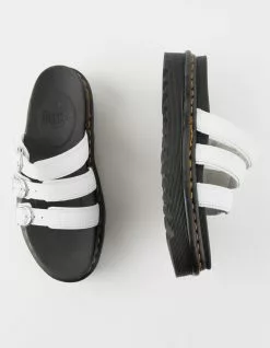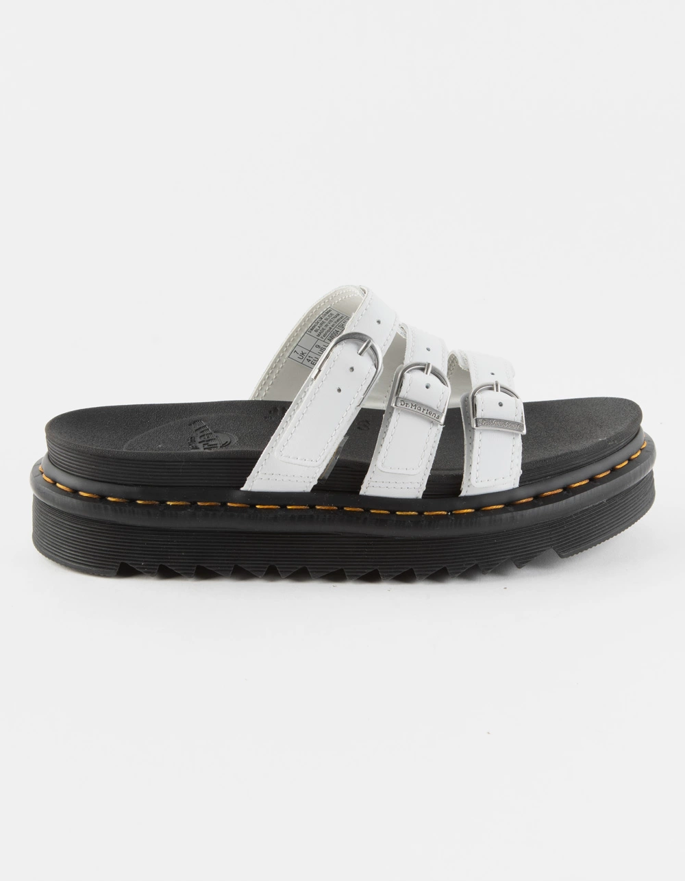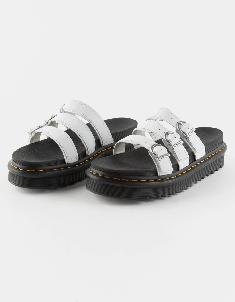 Dr. Martens Blaire Slide sandals. These flatforms sandals feature a strappy leather upper. Arched footbed with a slide wedge. Visible welt stitching. Buckle strap details. Approx. platform height: Imported.