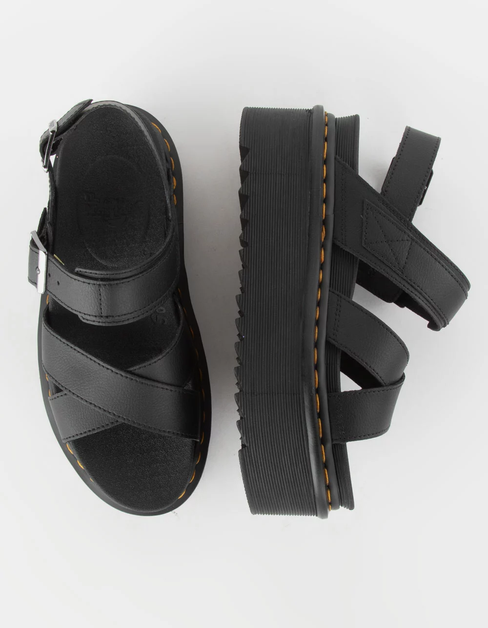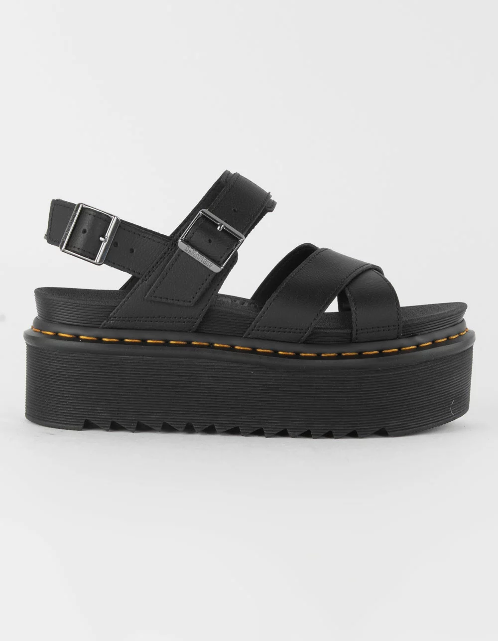 Dr. Martens Voss II Quad Athena Leather Strap Platform Sandals. The 2-strap Voss II sandal ready for the height of summer. A sleek, minimalist design. For those days out that spill into a night out. Towering on a 3 inch Quad Zebrilus sole, for maximum elevation with minimum weight. 2 gunmetal buckles on the ankle provide for a secure and comfortable fit. Finished with a signature yellow welt stitch.