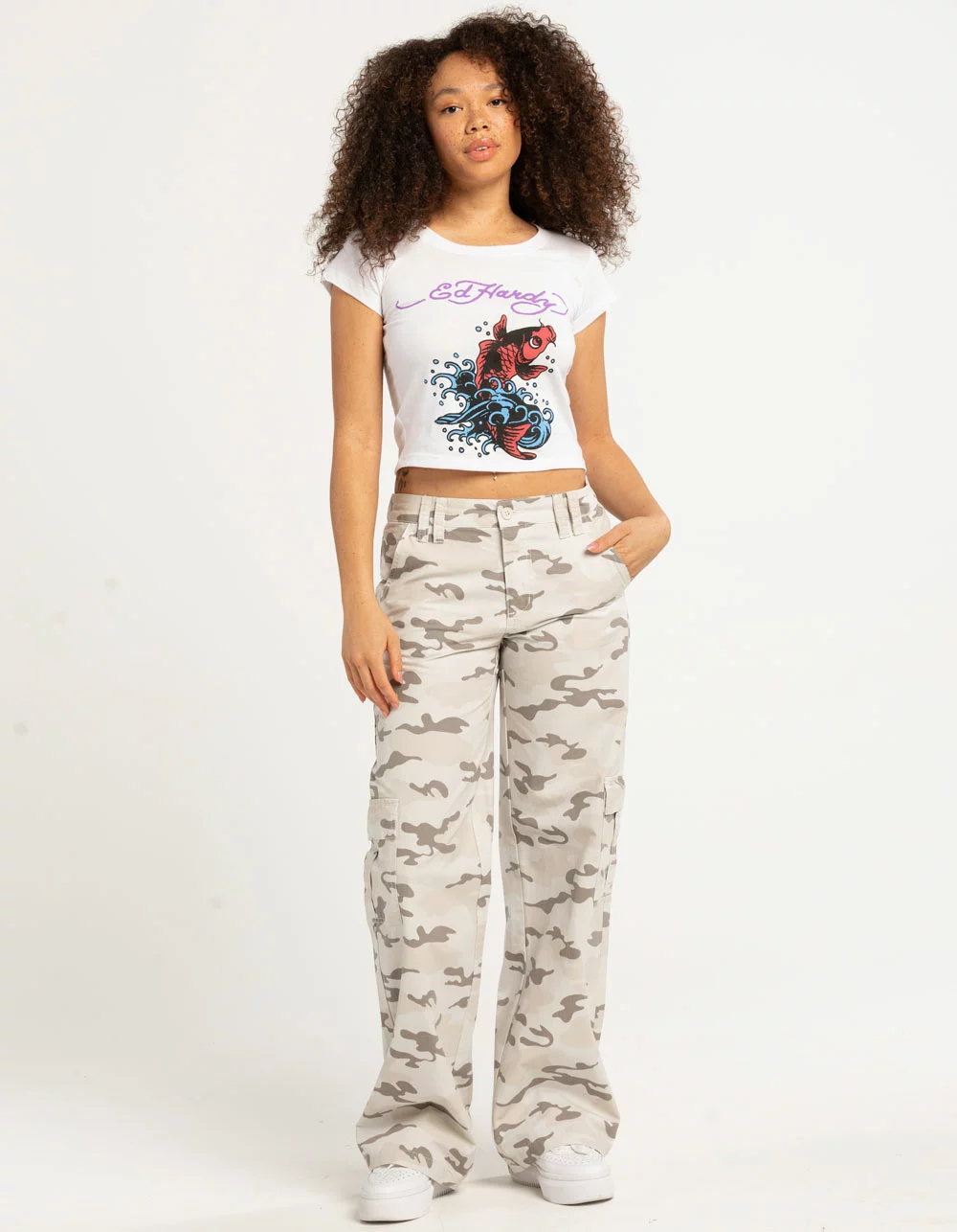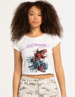 Ed Hardy Koi Fish Baby Tee. This one of a kind womens graphic tee is crafted with a light weight cotton jersey. Featuring a heavy garment wash providing a super-soft hand feel. Authentic Ed Hardy graphic screened on front. Ed Hardy script screened on back. Cropped fit with cap sleeves. Ribbed crew neckline. 100% Cotton. Machine wash. Imported.